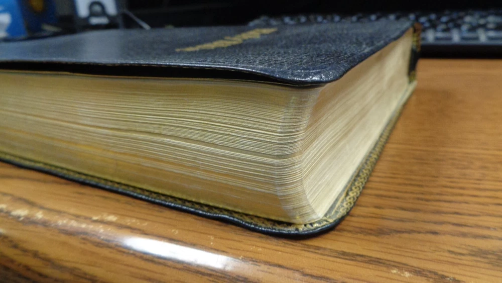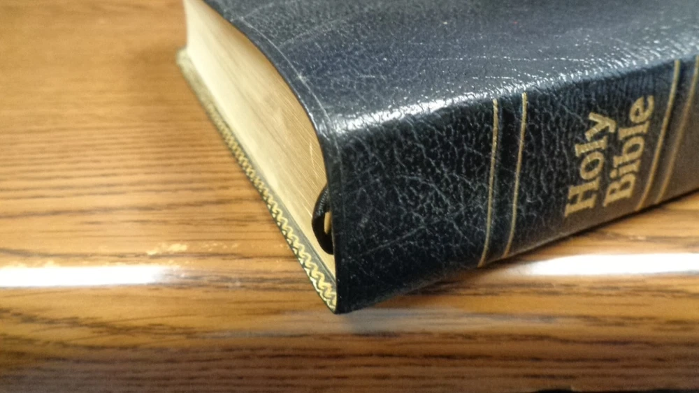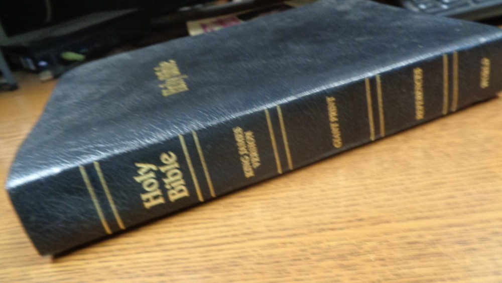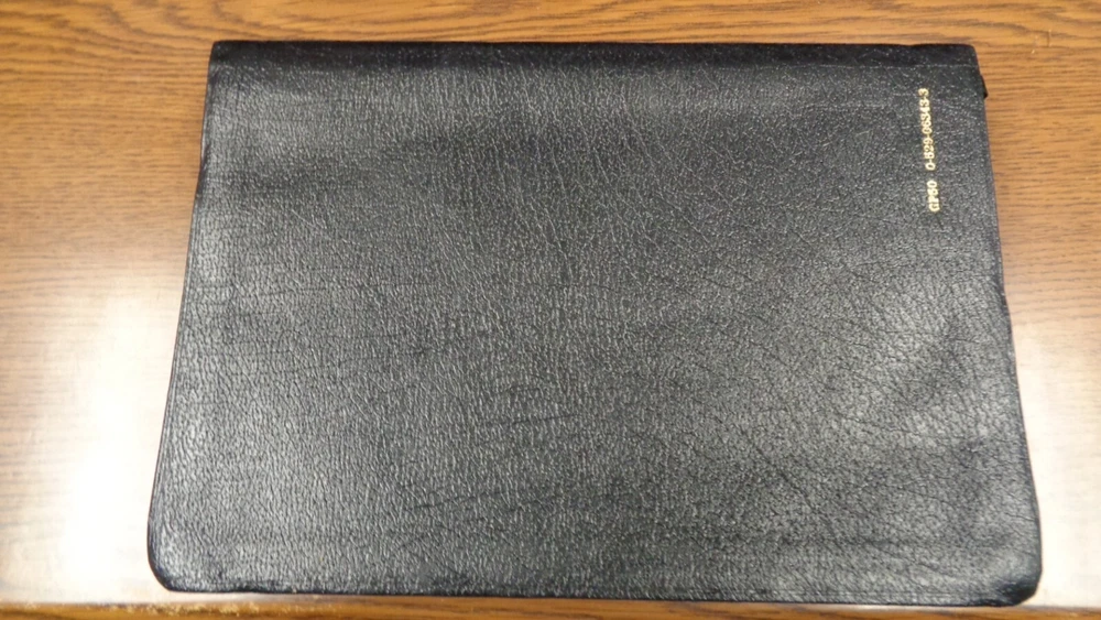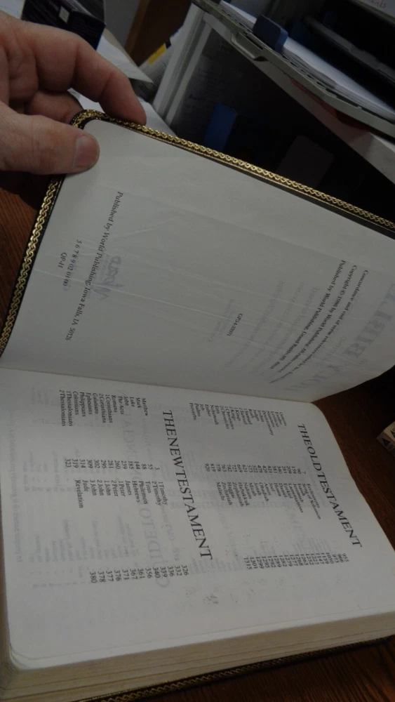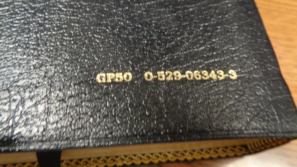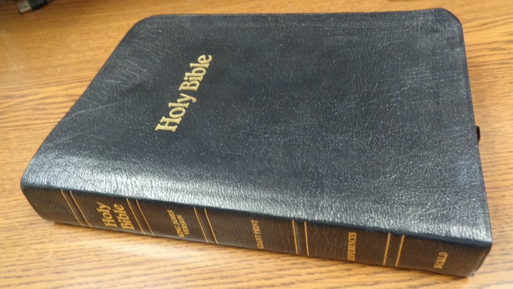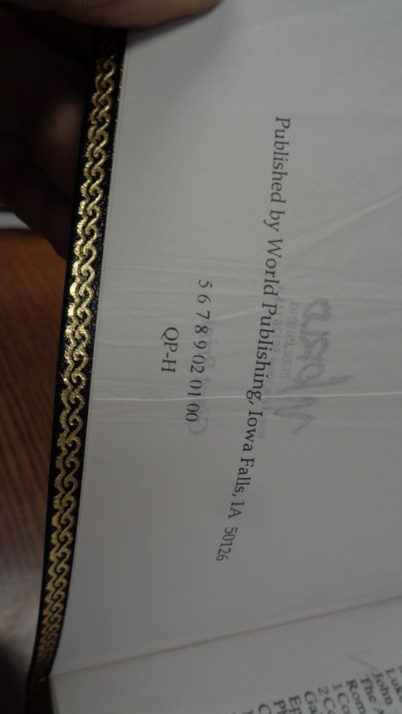 I think this is bound in bonded leather; not stated anywhere. References Edition Holy Bible; Giant Print; King James Version with Old & New Testaments, just a few study helps including The Words Of The Savior in red print. Title page states the book was published in Iowa. Latest date is 1986. Binding is black in color. Book measures about 9.5" tall, 7" wide and 1.25" thick. "Giant Print" is stated on the spine but the font is not what I would call giant; about 16vo I'm guessing but the print is clear and high quality. Please read on and see all photos. Book is used and has some reader-wear to a few pages. Previous owner ink on the Presentation page. No other marks nor ink anywhere that I can find, no notes or highlights but have not leafed through the entire text-block. Covers took some mild bumping. Gold page-edges are mildly rubbed, gilded lettering and emblem on spine and have lost some of their luster. Some pages were dog-eared. I tried to flatten them all but I may have missed a few. No scent nor stains. Free US postage, please note that while making an offer. Off-shore buyers are warmly welcome.