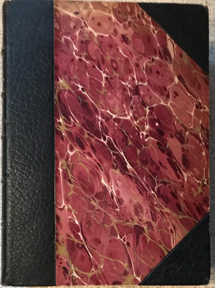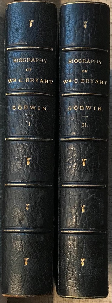 This is "A Biography of William Cullen Bryant" by Parke Godwin, in a first edition published by D. Appleton in 1883 (same date on the title page and the publisher's page). This edition features a two-volume set, bound in black leather over red marbled paper-covered boards, with raised spine bands, gilt spine decoration and lettering and gilt top edges. There is a frontispiece engraving in each volume. Condition of this set is Very Good Minus; it is an ex-library volume discarded by the Redwood Library in Newport, RI (the oldest continuously operating library in the U.S.). There is some wear to the corners and along the spine, and it bears a historic library bookplate on the LFEP and a list of library regulations (one cent fine per day for overdue books!) on the LREP. Other library marks are present, but none on the exterior, so this set has a lovely shelf presence. Please see my other 19th-century literature listings.