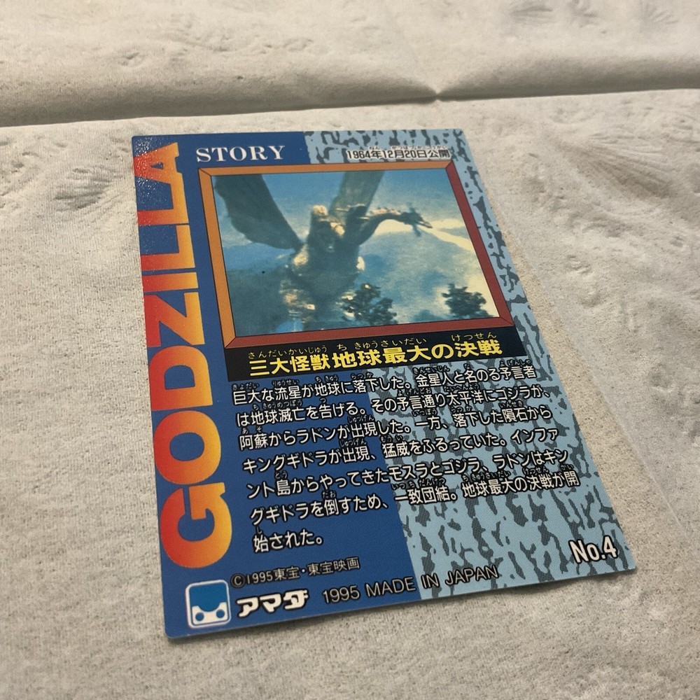 This trading card features the iconic monster Godzilla from the 1995 film. It is a must-have for any fan of sci-fi and the Godzilla franchise. The card is from the non-sport trading card category and is in very good condition. The card was manufactured in 1995 and belongs to the trading card singles category. It is number 4 in the series and depicts Godzilla in all its glory. This collectible item is perfect for anyone who wants to add to their collection of Godzilla merchandise. Get your hands on this Godzilla trading card today!