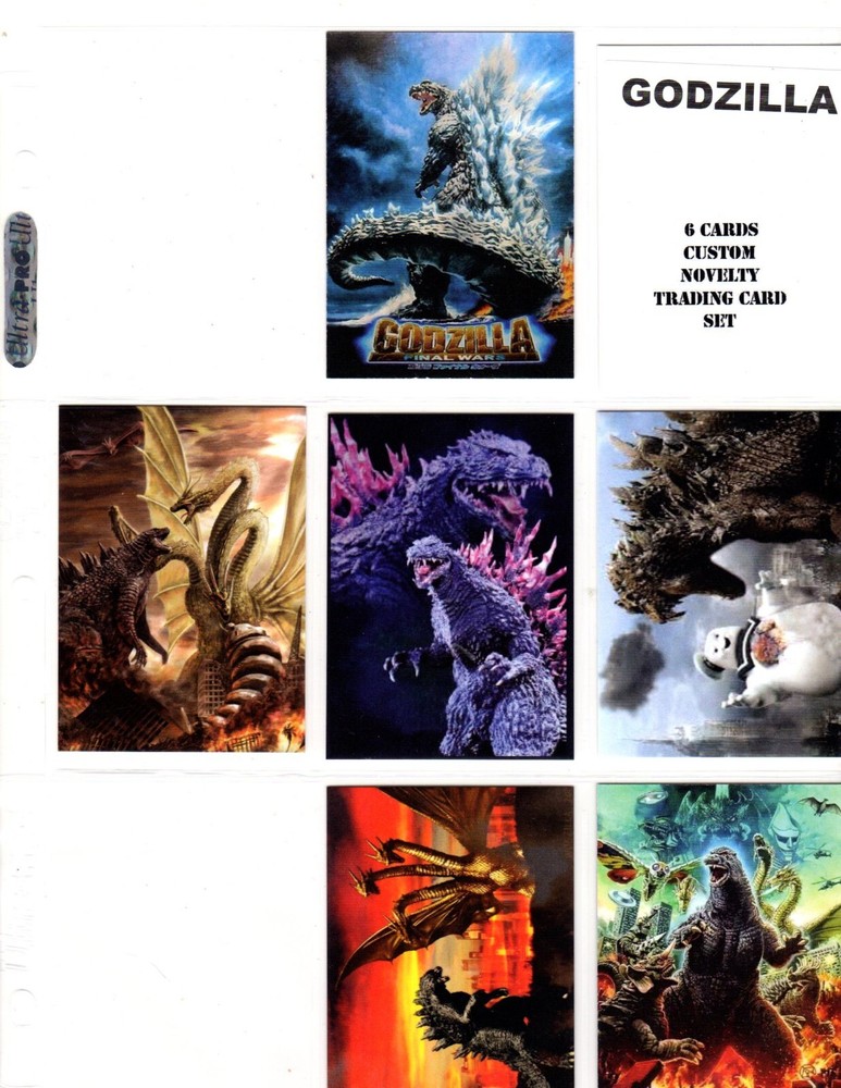 GODZILLA CUSTOM TRADING CARD 6 CARDS SET THIS IS A NOVELTY CARD THAT IS CUSTOM MADE. THESE CARDS ARE ON NEW THICKER CARD STOCK. FIRST PHOTO IS THE FRONT THE LAST PHOTO IS THE BACK.