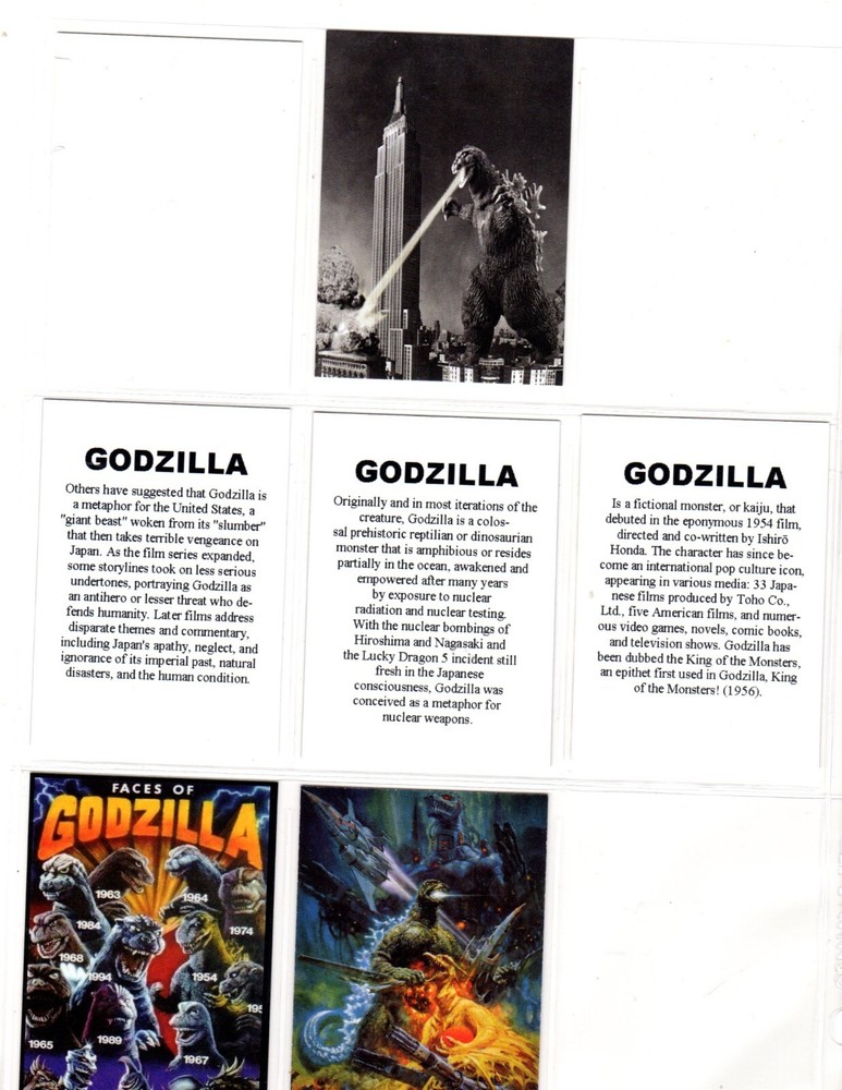 GODZILLA CUSTOM TRADING CARD 6 CARDS SET THIS IS A NOVELTY CARD THAT IS CUSTOM MADE. THESE CARDS ARE ON NEW THICKER CARD STOCK. FIRST PHOTO IS THE FRONT THE LAST PHOTO IS THE BACK....