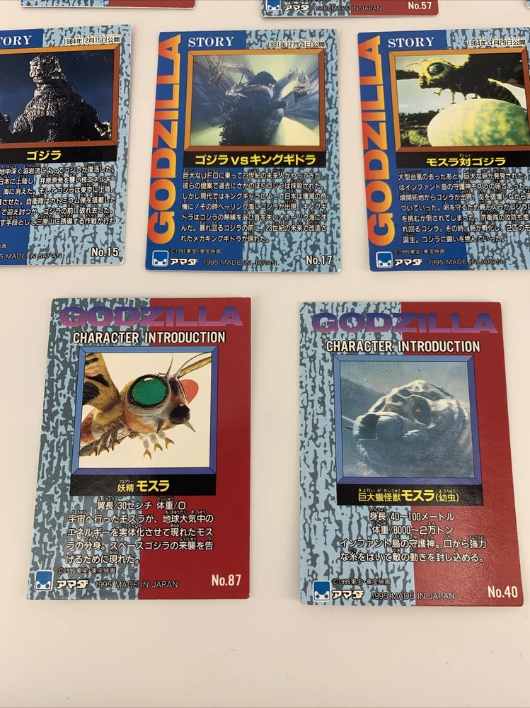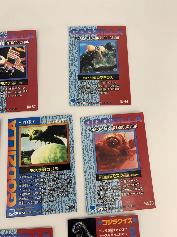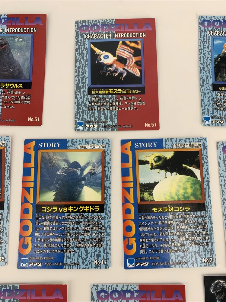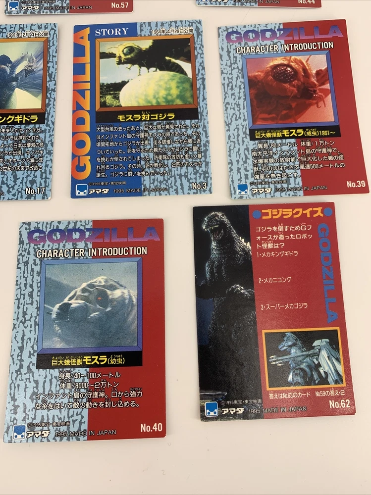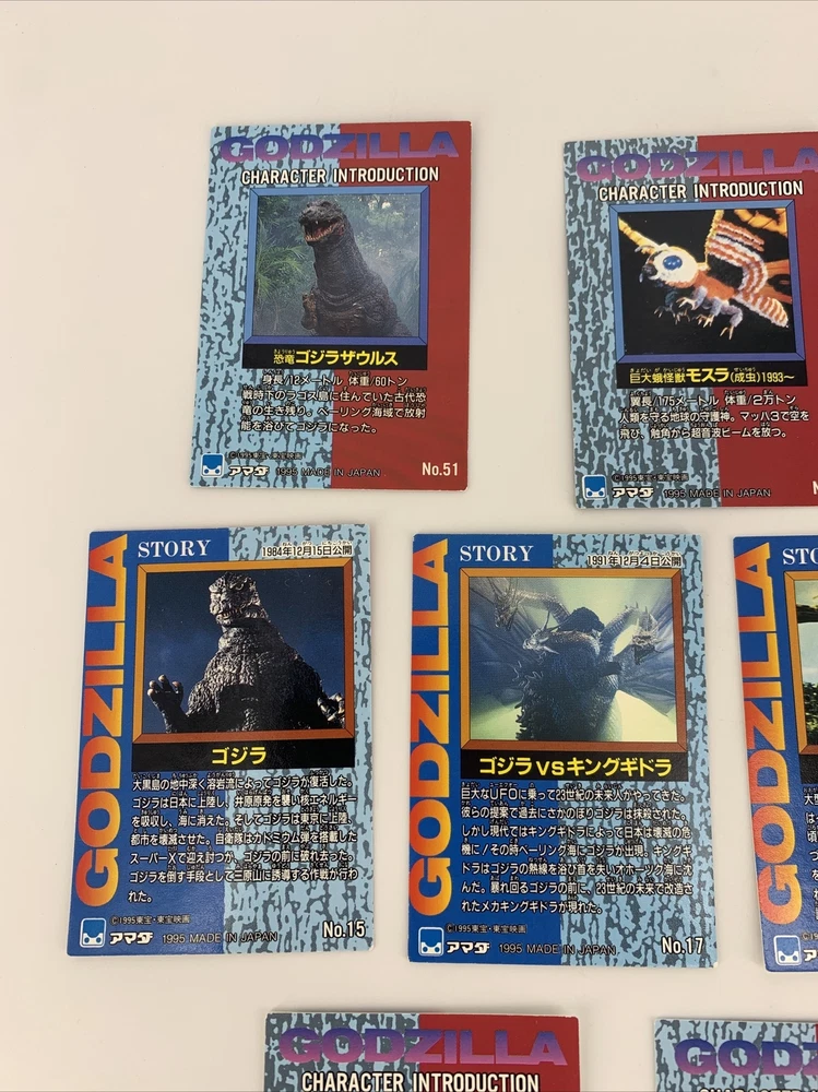 GODZILLA Japanese Cards 1995, JPP/Amada # 3, 15, 17, 39, 40, 44, 51, 57, 62, 87.
