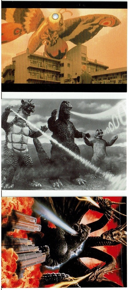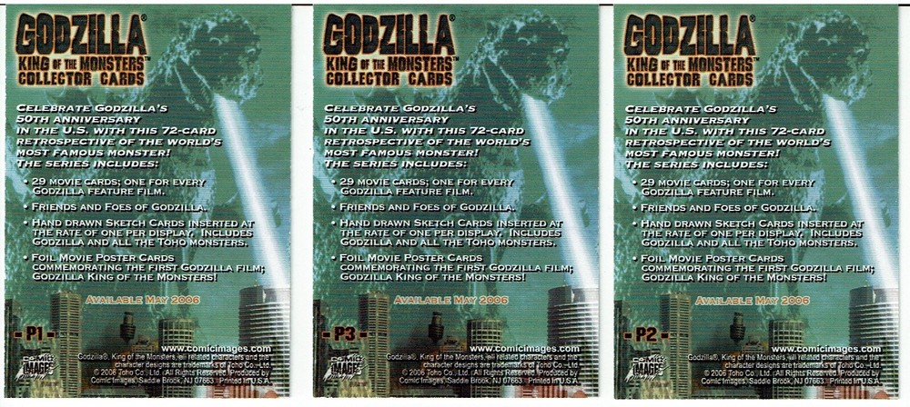 Promo card P1, P2 and P3 from the Godzilla King of Monsters card set produced by Comic Images in 2006 excellent condition if there is anything we can help with please enquire. please visit my ebay store to check out my other auctions. About us: We have been in the collectables business for 20 years and have a vast inventory of products. We stock Trading cards, Collectible card games, Comics and Transformers Toys. Payment: We will combine shipping whenever possible. Please request an invoice if you want a combined total. We don't always spot overpayments and we don't want you to feel that you've been overcharged. Please pay within 7 days except by prior arrangement. We will file with ebay to reclaim our costs on unpaid items. Shipping Costs: We will combine shipping where ever we can, please ask us or request an invoice if your not sure. Please note sell sheets cannot be combined with other items. Please do not purchase several items and pay for them all separately this causes no end of headaches especially if you later decide you wanted to combine shipping. We dispatch items on a Monday and a Thursday. If you need your item really urgently please drop us an email and we will try and help. Delivery times: Please be aware that the post office are extremely incompetent. UK items should be delivered in 1-2 days but it is possible for them to take longer. We will consider an item lost after 14 days and replace or refund at this point. International items should be delivered in 5-7 days but it is possible for them to take up to 28 days, we really don't understand why. We will consider and item lost after 28 days and replace or refund at this point. If you are concerned please purchase the tracked option Special Delivery/Airsure. We have never (fingers crossed) had an item get lost using these two methods. Returns: Incorrect or Damaged Goods: We try our hardest not to make mistakes but we're only human and occasionally mistakes do happen. In the rare instance that this happens please email us and tell us the problem. Unfortunately we're not blessed with psychic powers so we need to be told that there's something wrong. Leaving a rant on our feedback doesn't help anyone, please talk to us. We will always try and correct any problem. Unwanted or mistakenly purchased Items: We operate the standard ebay 14 day returns policy, please return the items to us exactly as they have been shipped. Items that have had parts removed or been damaged by you will not be refunded. We will only refund the cost of the item. If you simply changed your mind then we will retain the p&p that we've paid out. Collecting trading cards can be dangerous, all cards are sold by trained athletes, do not attempt this at home bla bla bla.