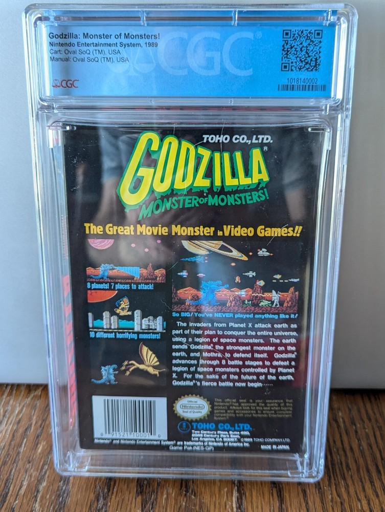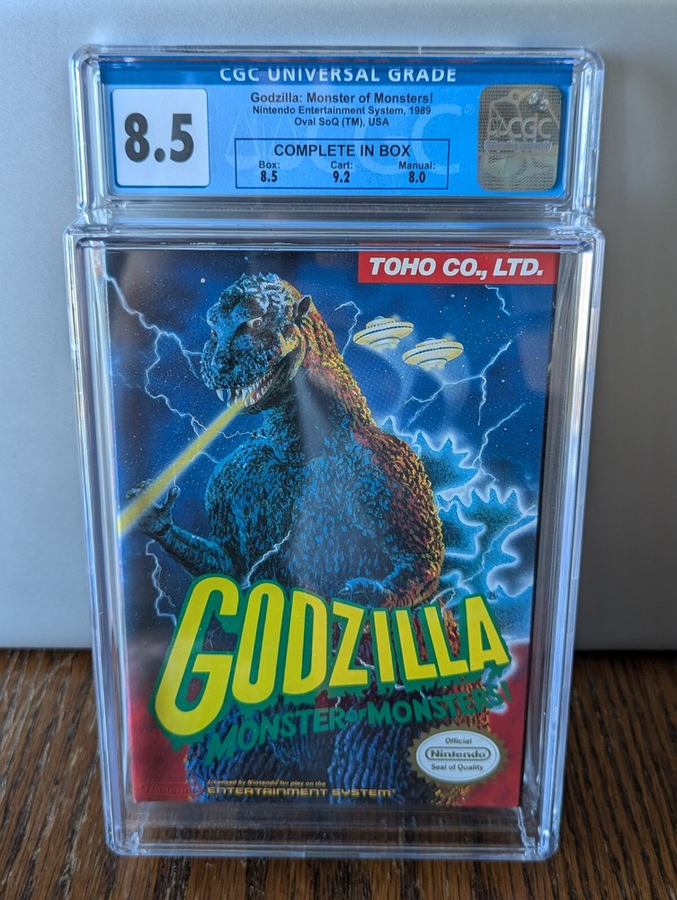 This is a must have for any Godzilla and/or video game collector. This is a complete inbox NES game, graded by CGC. Overall grade of 8.5 (box 8.5, cartridge 9.2, manual 8.0). This comes from my own personal collection, adult owned/handled, from a smoke free home. Game is now well preserved for any avid collector.