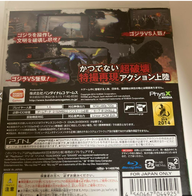 GODZILLA PS3 Bandai Namco entertainment Sony Playstation 3 Video Game from JP Description About This Items Thank you for taking interest of this item!! Condition Pre-owned item, but condition is very good. Shipping We always send the item with a tracking number. So please place an order without any concern on delivery. You can always track the delivery status. Shipping is only available to the address registered in eBay. If you want us to send another address, please change your address on eBay and then place an order. Shipping is available from Monday to Friday. Weekends are not available because freight (shipping) companies are closed. We do not mark merchandise values below value or mark items as “gifts” – Japan, US and International government regulations prohibit such behavior. About Importer's Obligation Import duties, taxes, and charges are not included in the item price or shipping cost. These charges are the buyer's responsibility. Please check with your country's customs office to determine what these additional costs will be prior to bidding or buying. Thank you for your understanding. Arigato-Gozaimasu!!