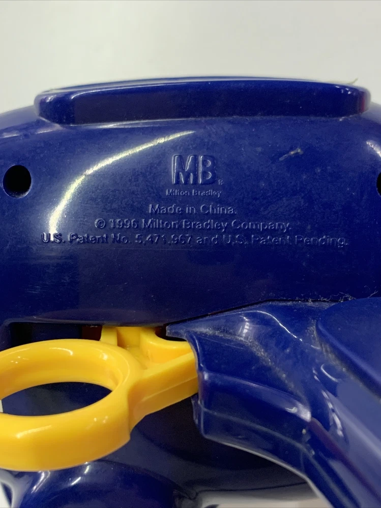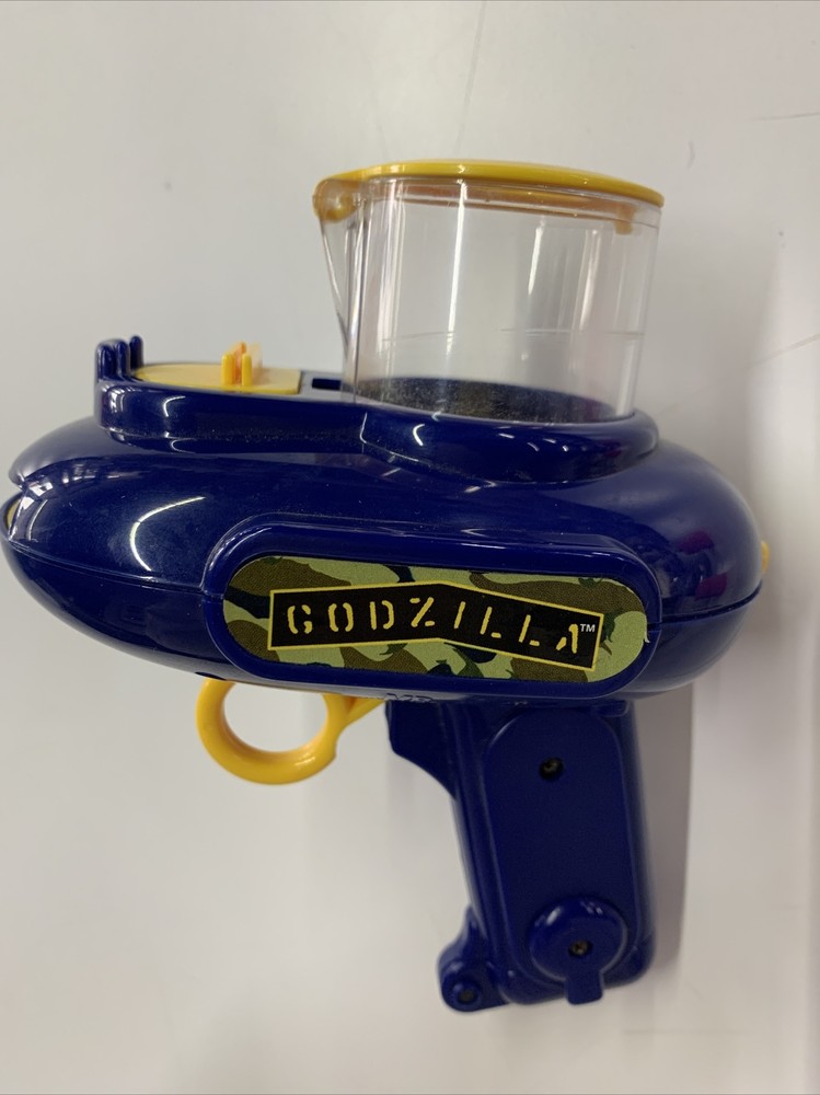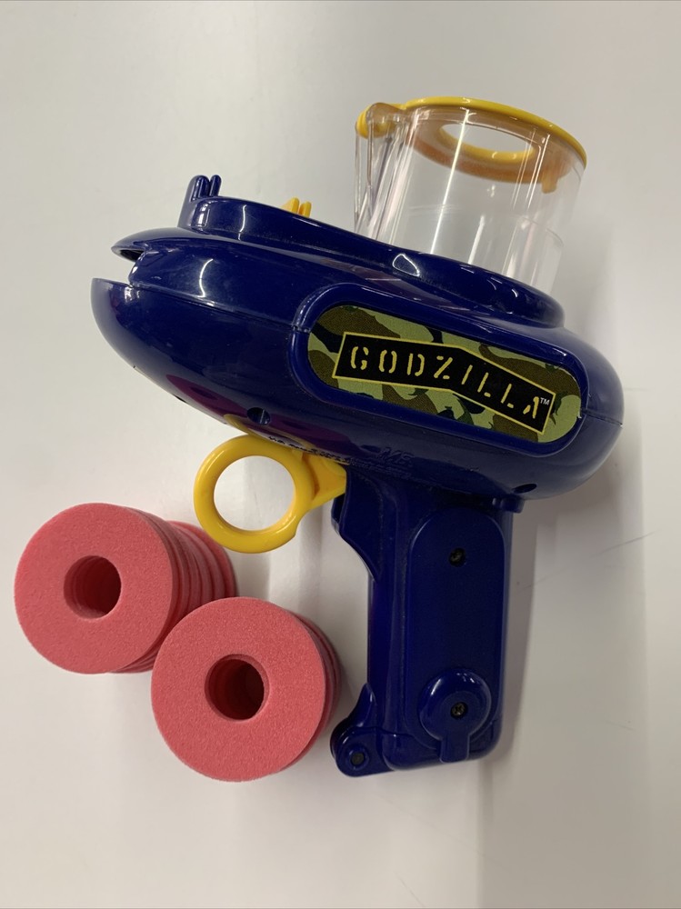 GODZILLA SPACE SHOOTER TARGET GAMES 1996 Milton Bradley Tested Works! Includes 18 soft foam discs. The gun sight is missing.