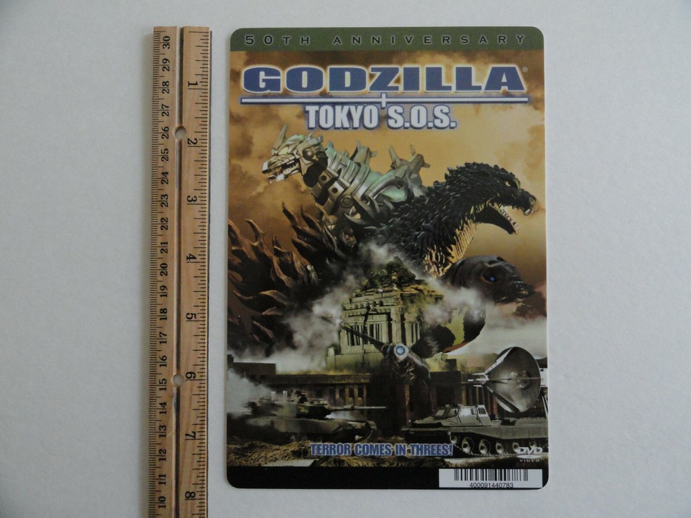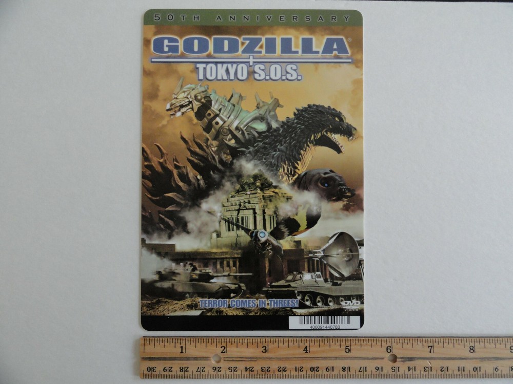 *** NO MOVIE INCLUDED DISPLAY MOVIE BACKER CARD ONLY*** "GODZILLA- TOKYO S.O.S" THIS ITEM IS A SHELF DISPLAY BACKER CARD USED IN BLOCKBUSTER VIDEO STORES. CARD MEASURES APPROXIMATELY 5.5" X 8" IN SIZE. DISPLAY MOVIE BACKER CARD ONLY, NO MOVIE CARD WAS USED IN BLOCKBUSTER VIDEO STORE SHELVES TO INDICATE WHERE THE MOVIE WOULD BE IF ALL COPIES WHERE RENTED OUT AT THE TIME. CARD HAS THE SAME PICTURE AS WAS ON THE COVER OF THE DVD OR BLU-RAY. THIS VERSION IS THE OLDER AND HARDER TO FIND HARD PLASTIC VARIETY. THESE ARE ON A MORE GLOSSY PLASTIC CARD AND LOOK GREAT. A VERY RARE ITEM AS THEY WERE NOT SOLD IN STORED AND USUALLY DISCARDED AFTER THE MOVIE WAS NO LONGER RENTED. THESE LOOK GREAT MATTED AND FRAMED FOR YOUR ENTERTAINMENT ROOM OR JUST AS A GREAT COLLECTIBLE. DISPLAY MOVIE BACKER CARD ONLY SEE ALL THE PHOTOS FOR CONDITION OF THIS ITEM. SHIPPING IS FOR US LOCATIONS ONLY. THIS ITEM WILL BE PACKED CAREFULLY TO ENSURE IT'S SAFE ARRIVAL. IF YOU ARE INTERESTED IN MORE THAN ONE CARD LET ME KNOW BEFORE PAYING FOR DISCOUNTED SHIPPING. IF YOU ARE AN INTERNATIONAL BIDDER YOU MUST CONTACT ME FIRST TO SEE IF I CAN SHIP TO YOUR LOCATION AND TO AGREE ON COST OF SHIPPING AND HANDLING BEFORE PURCHASE. THIS IS FROM MY OWN PERSONAL COLLECTION FROM A SMOKE FREE ENVIRONMENT. I WILL BE SELLING OFF A HUGE COLLECTION OF DVD'S, LP'S, BOOKS, COLLECTABLES FROM YEARS OF COLLECTING. LARGE AMOUNT OF BOWIE, STONES, AND TONS OF OTHERS. JUST CHECK BACK OFTEN AS I DIG THEM OUT AND GET THEM LISTED. WILL RANGE FROM THE COMMON TO THE VERY OBSCURE. NEVER KNOW WHAT WILL BE UP NEXT. MUSIC, MOVIES, SONGBOOKS, PROMO'S. AS ALWAYS THANK YOU FOR LOOKING AT MY ITEMS. AND CHECK OUT MY OTHER ITEMS FOR BID.