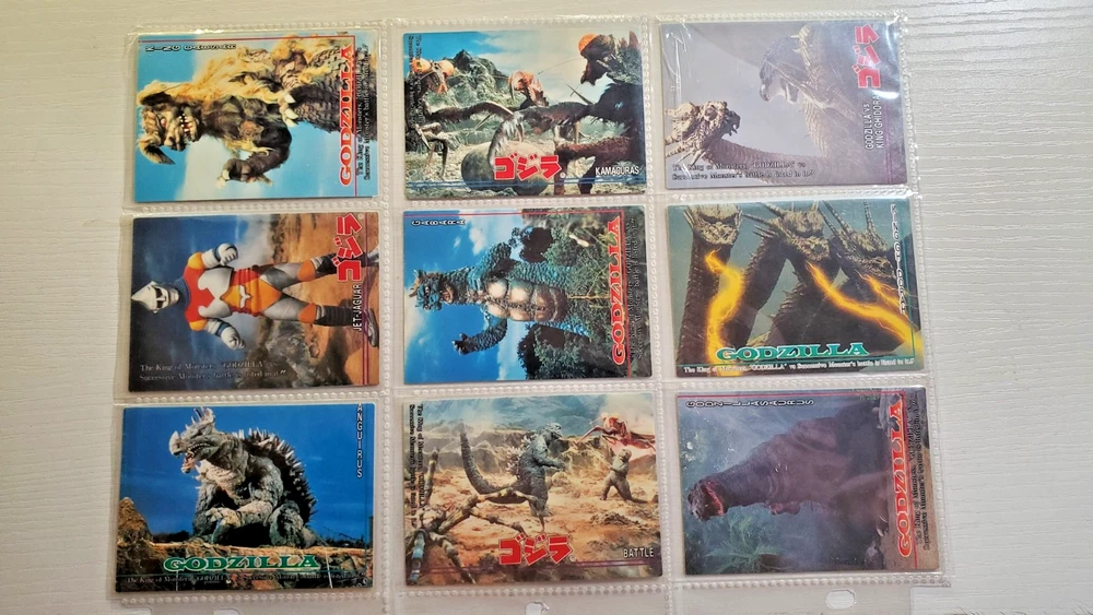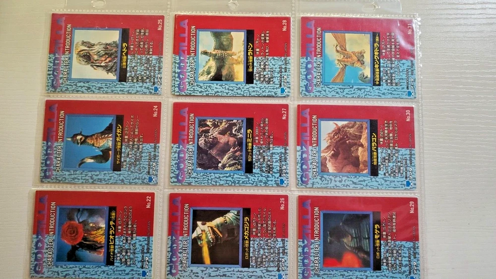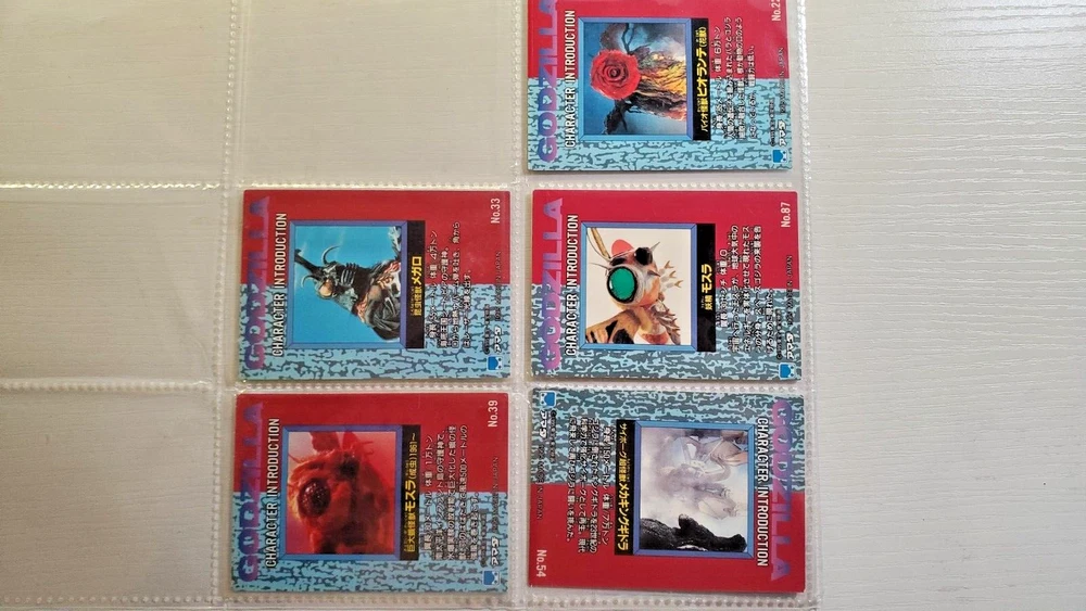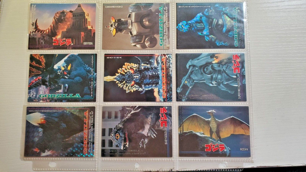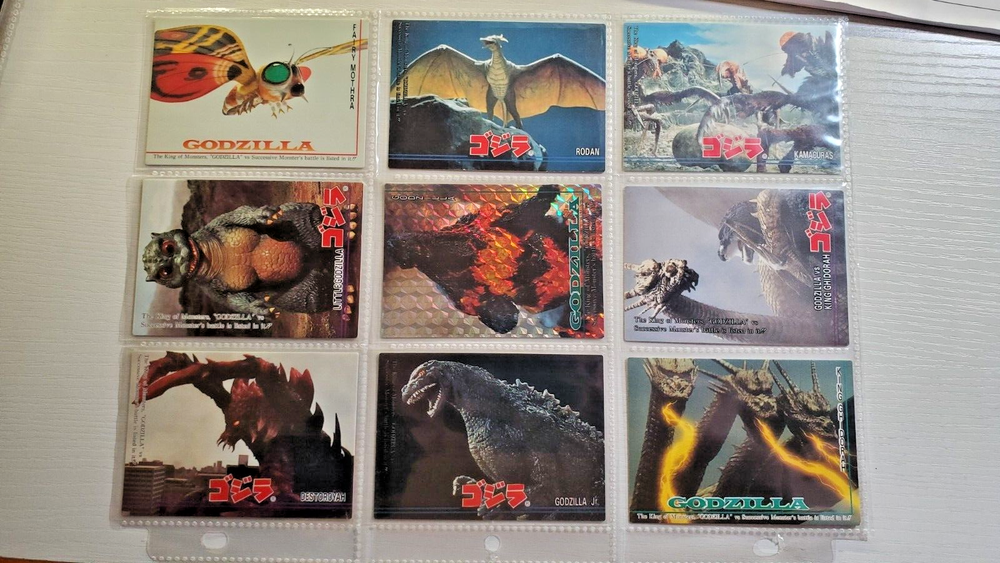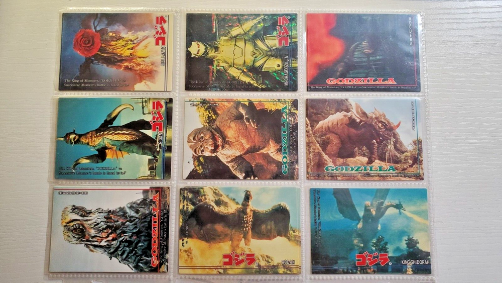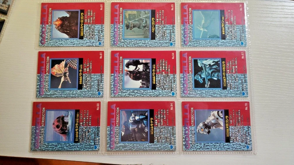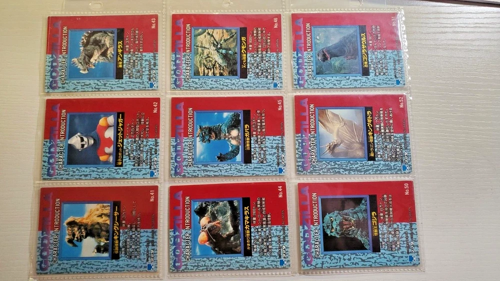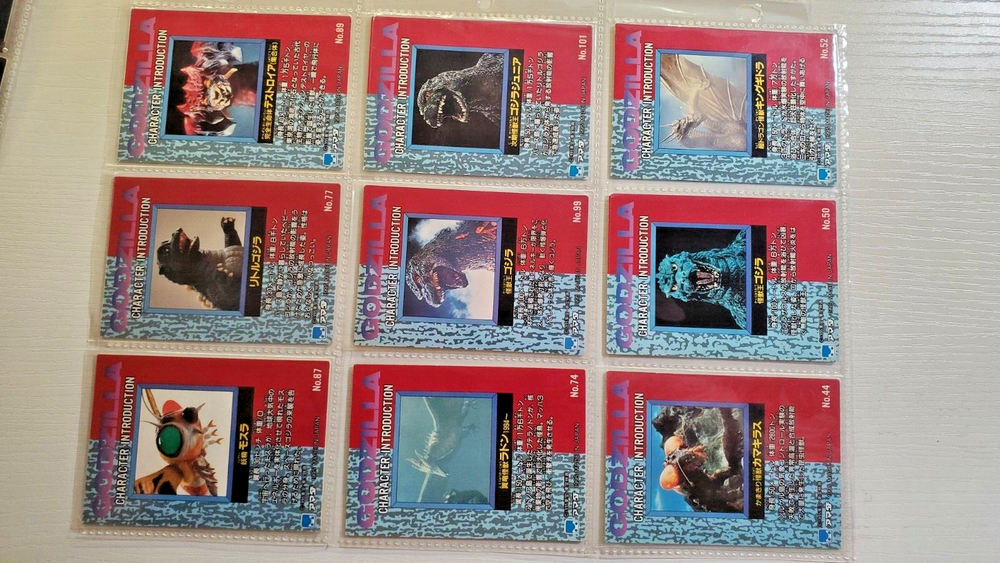 This is a rare 1995 Amada Godzilla trading card set, featuring 50 cards introducing different characters from the Godzilla franchise. The cards are made of card stock and are in Japanese language. These vintage non-sport trading cards are original prints, not reprints, and are part of a sci-fi genre collection. The cards showcase the iconic Godzilla character and were manufactured in Japan by Amada.