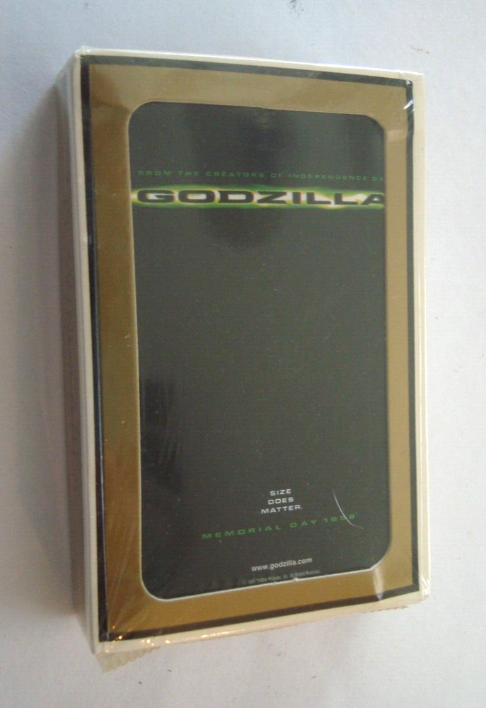 The product is a set of playing cards promoting the 1998 movie "GODZILLA" by TriStar Pictures. These playing cards likely feature images or artwork related to the movie, adding a collectible and promotional aspect to a common item. Fans of the movie or collectors of movie memorabilia may find these playing cards to be a unique and interesting addition to their collection. FREE shipping in the USA.