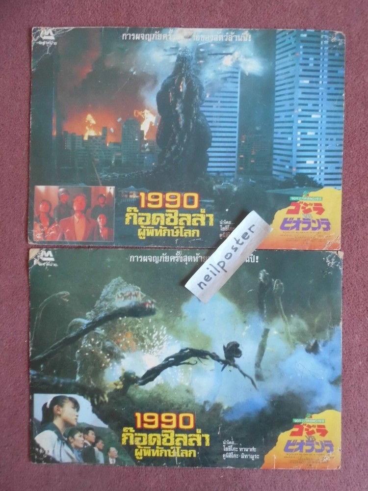 Two original Thai lobby cards for GODZILLA VS BIOLLANTE (1989), the Japanese Toho movie. As well as the main image, each has a scene from the film at bottom left. The title and credits are given in Japanese in the bottom right corner. They measure 10” by 14¼”. In fair / good condition. There are corner pin-holes and some corner damage. There is writing on the backs, which are grubby. Having said all that – these are extremely scarce. I accept payment by Paypal. I WILL COMBINE ITEMS AND SAVE YOU POSTAGE COSTS. New items added nearly every day.