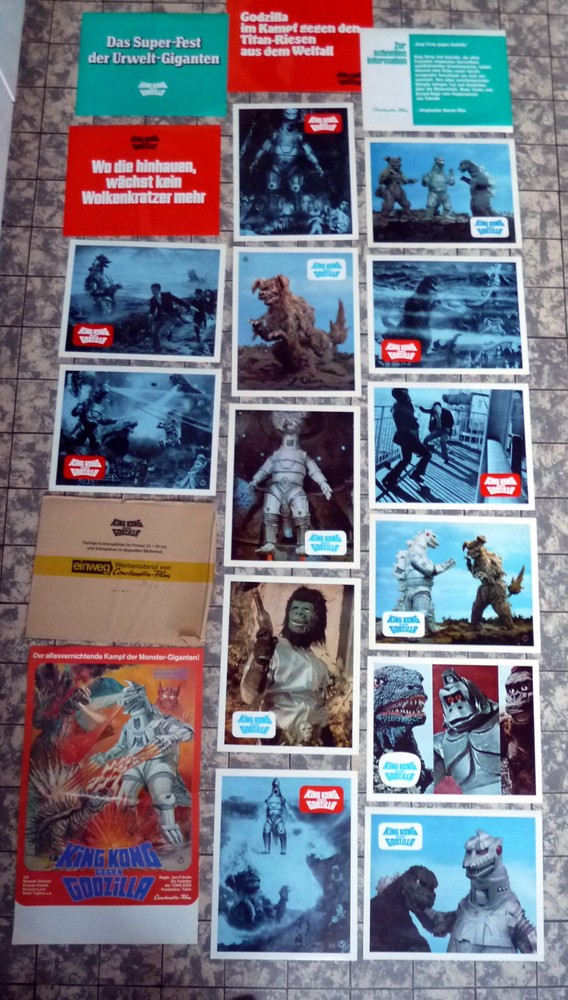 20 Original German Lobby Cards > compl. Set (incl. 4 Text-Motives) plus Small Poster, from German theatrical first release in 1974, Directed by Jun Fukuda "Godzilla vs. Mechgodzilla" O. T.: Gojira tai Mekagojira aka Godzilla - Godzilla gegen King Kong Godzilla gegen King Kong Godzilla gegen Mechagodzilla Godzilla vs. Bionic Monster Godzilla vs. Cosmic Monster Godzilla vs. Mechagodzilla King Kong - Monster aus der Tiefe Measures: approx.: 11.8x9.45inches ca. 30x24 cm Description/Condition: 16 Original German Lobby Cards incl. 4 Text-Motives), plus small Poster, from German theatrical first release in 1974 . Lobbies show ing NO Pins and minor signs of w ear, excellent/near mint Shape, w atch XXL-Photos. Distributor`s Envelope will be enclosed as well. S hipping Costs / Auslandsversand: European Union and Overseas: € 9.00 USD by registered Mail only (Nur per Einschreiben). Important: Please wait with your payment, until you receive my revised invoice, because you have to pay Shipping costs only once (especially for custumers from abroad, who are buying more than 1 Article)!!! Please help to avoid further Transaction-charges/fees etc. Thank you very much ! For further Questions do not hesitate to contact me.