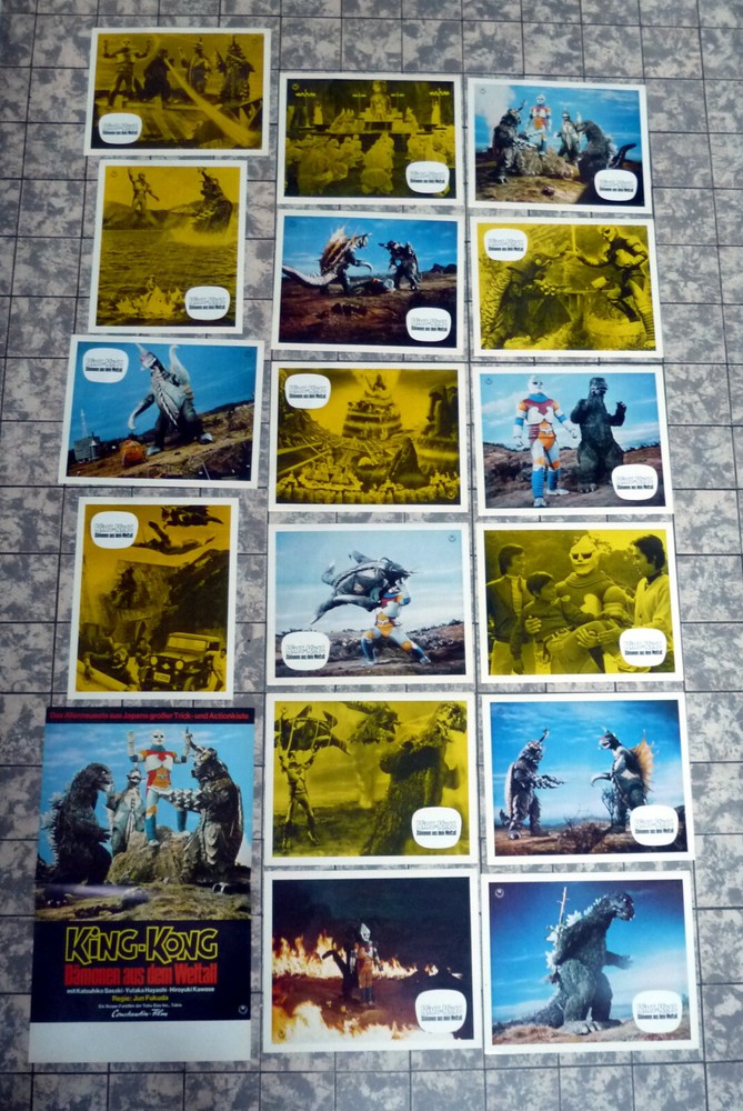 20 Original German Lobby Cards > compl. Set (incl. 4 Text-Motives) plus Small Poster, from German theatrical first release in 1973 "Godzilla vs. Megalon" O. T.: Gojira tai Megaro aka Godzilla gegen Megalon Godzilla versus Megalon Godzilla vs. Megalon Measures: approx.: 11.8x9.45inches ca. 30x24 cm Description/Condition: 20 Original German Lobby Cards incl. 4 Text-Motives), plus small Poster, from German theatrical first release in 1972 . Lobbies show ing NO Pins and minor signs of w ear, excellent/near mint Shape, w atch XXL-Photos. Distributor`s Envelope will be enclosed as well. S hipping Costs / Auslandsversand: European Union and Overseas: € 9.00 USD by registered Mail only (Nur per Einschreiben). Important: Please wait with your payment, until you receive my revised invoice, because you have to pay Shipping costs only once (especially for custumers from abroad, who are buying more than 1 Article)!!! Please help to avoid further Transaction-charges/fees etc. Thank you very much ! For further Questions do not hesitate to contact me.