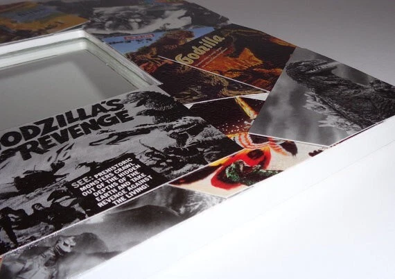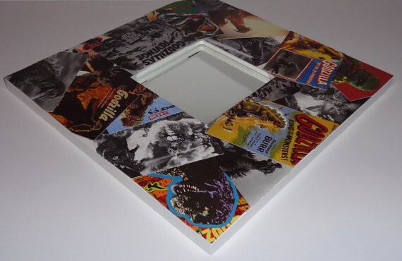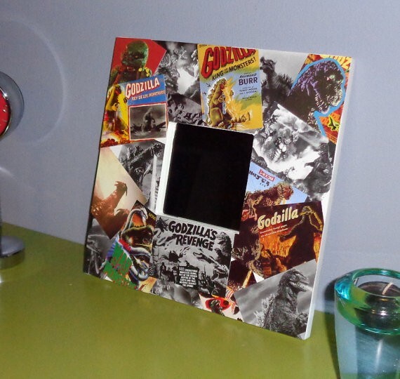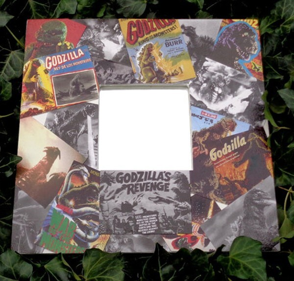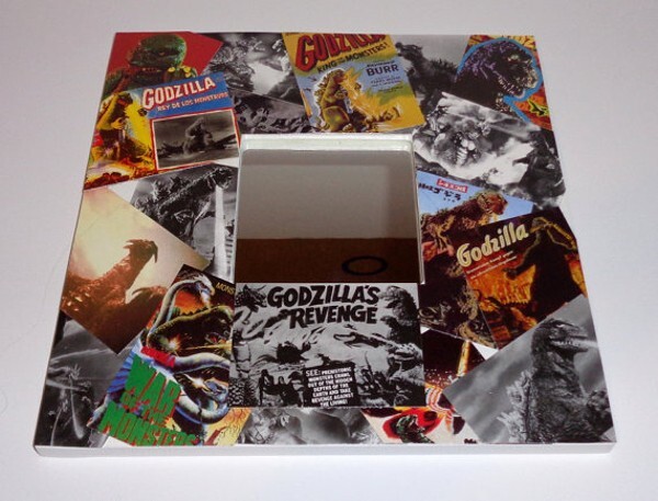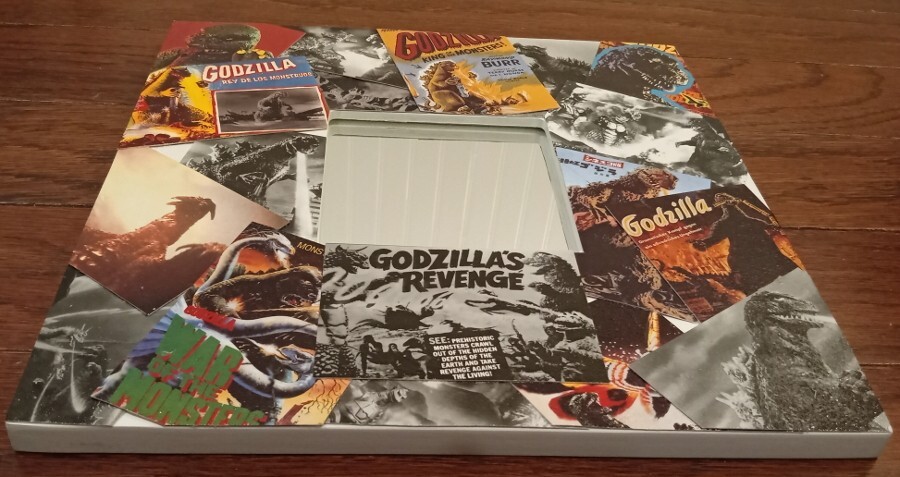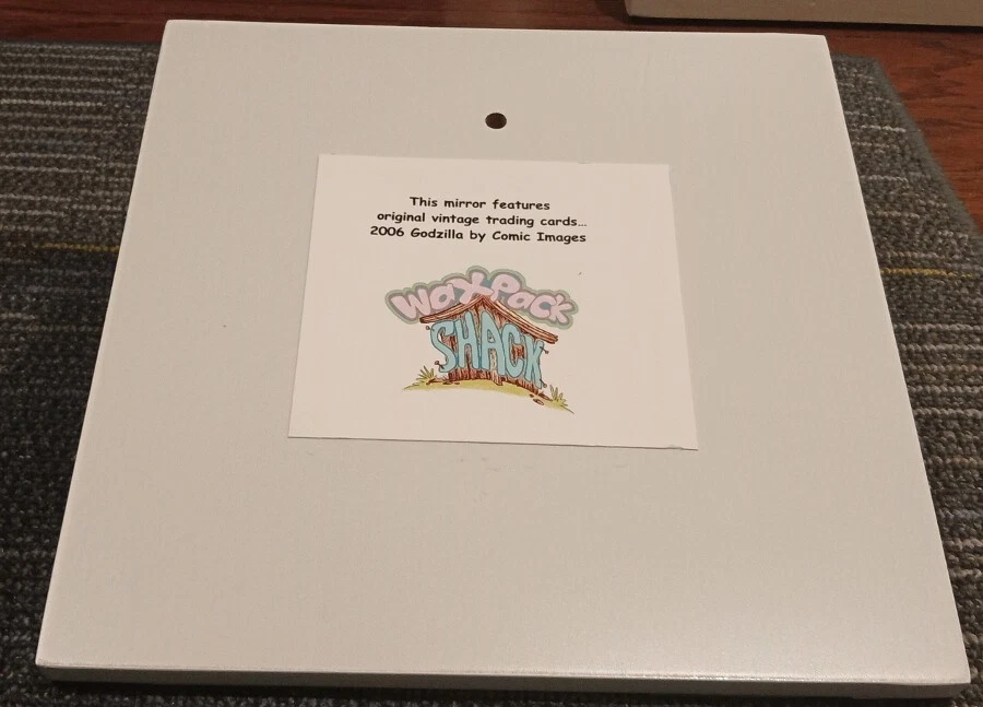 *GODZILLA... unique one-of-a-kind, HAND CRAFTED decorative wall mirror, made by WaxPack Shack. *Topped with layers of ORIGINAL trading cards/wax packs/bubble gum cards. Each mirror has a different design. *This mirror includes trading cards from 2006 by Comic Images, featuring movie posters and scenes from the GODZILLA movie series. *Total size is 10" high x 10" wide x 1/2" deep. Mirror in center is 4" x 4". *Coated with a non-toxic clear glossy sealer. *Hole in the back for easy hanging. *Perfect gift for the collector who has everything. *Slight glare on some photos due to the glossy sealer. *Shipped flat rate USPS Priority Mail.