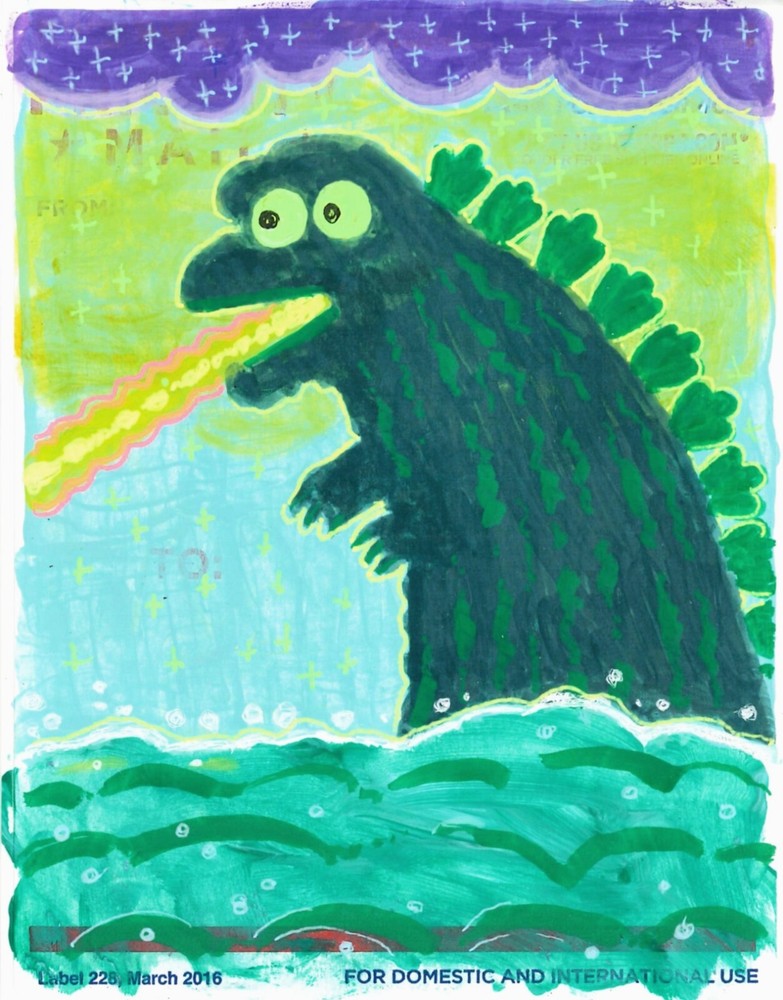 Godzilla, the O.G. kaiju. Paint and gel pen on USPS label 228. Love it, collect it, slap it up, or give it to that one weird friend. Please don't hesitate to message me with questions.