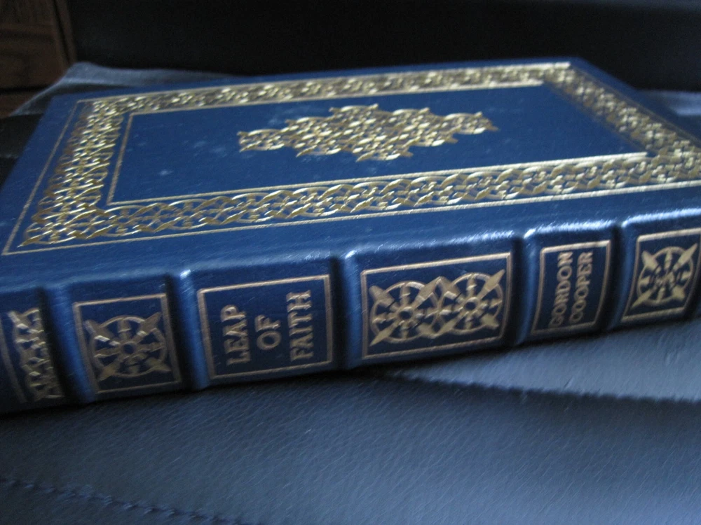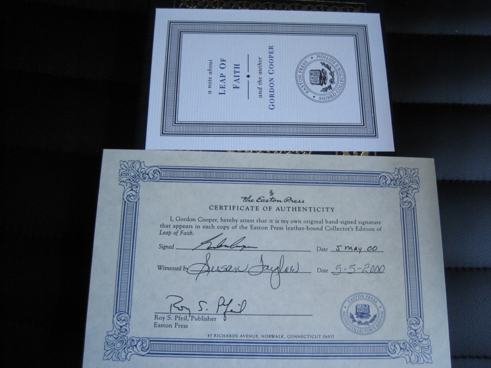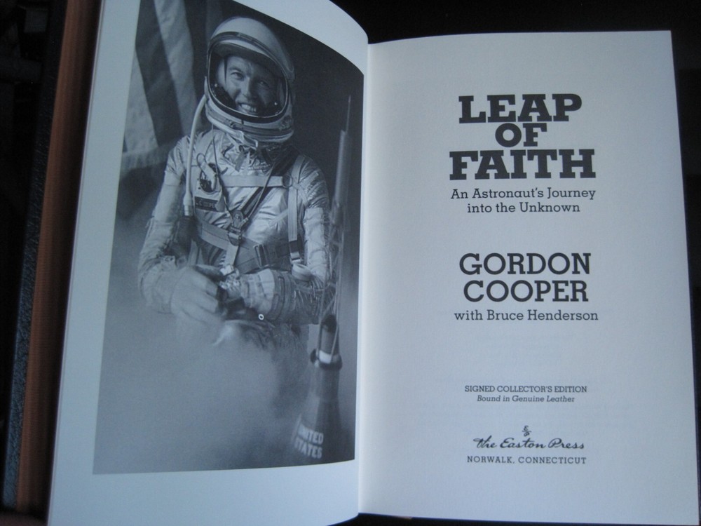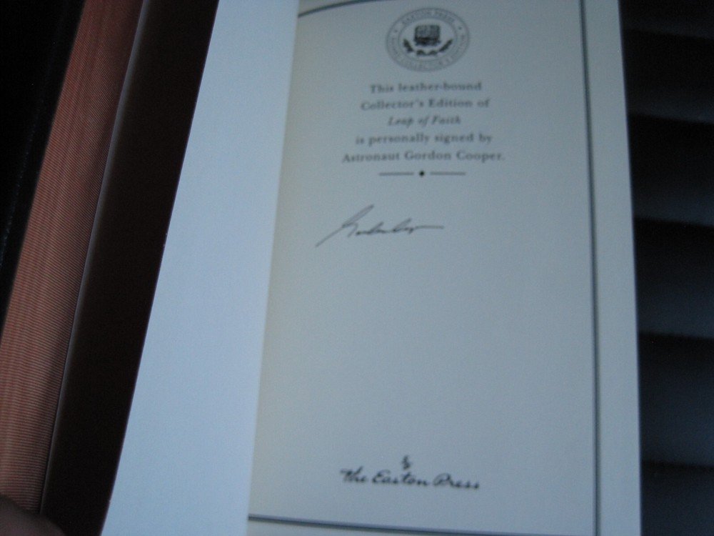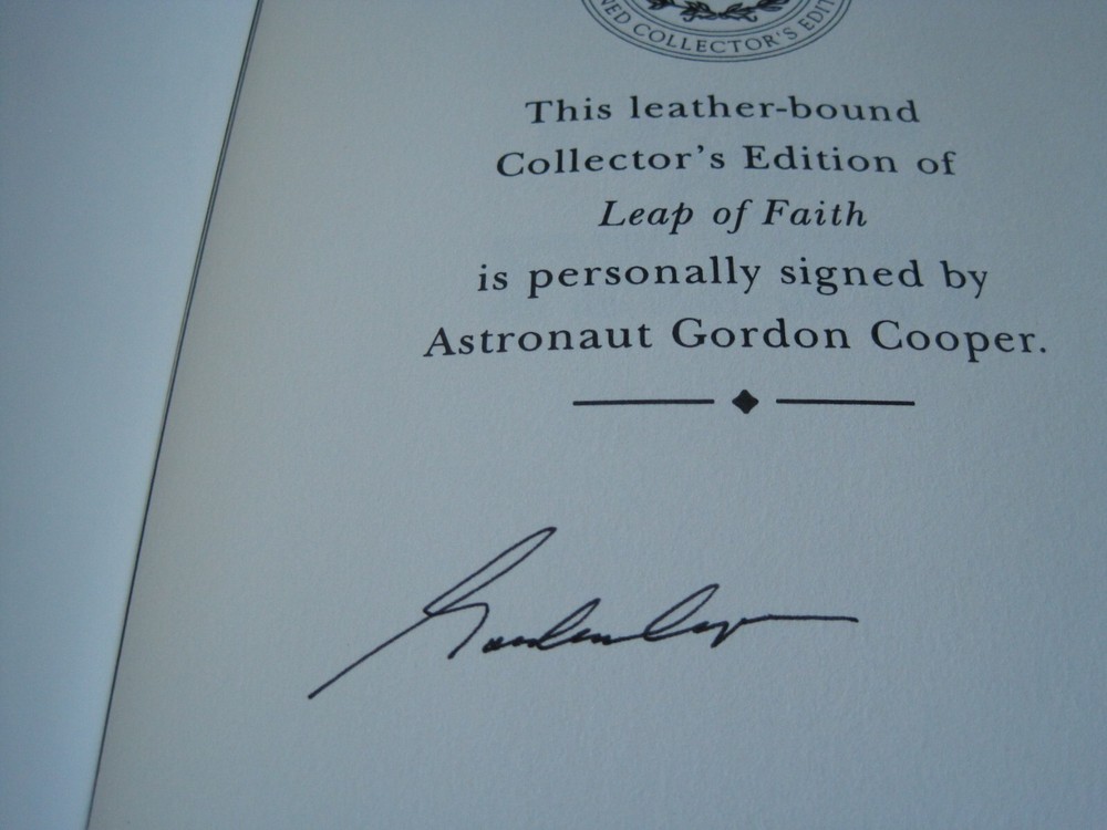 This is a leather bound signed collector's edition of Gordon Cooper's best-selling memoir - "Leap Of Faith" . Gordon “Gordo” Cooper was one of the original Mercury Seven astronauts, pilot for Apollo X, head of flight crew operations for the United States’ first orbiting space station, and the last American to venture into space alone. Stretching from the dawning days of NASA to the far reaches of the unknown, Cooper’s distinguished career as a record-setting astronaut helped shape America’s space program and blazed a trail for generations to come. In this astonishing memoir—written with #1 New York Times bestseller Bruce Henderson—Cooper crosses paths with such aviation luminaries as Amelia Earhart, Wiley Post, and German rocket scientist Wernher von Braun; he shares his early days at Edwards Air Force Base and the endeavors that became the basis for The Right Stuff ; he takes us inside NASA with candid accounts of his defeats and accomplishments; he reflects on the triumphs and tragedies of his heroic colleagues; and he finally reveals the reasons behind his belief in extraterrestrial intelligence, including the US military’s long-standing UFO cover-ups. The book is unread and in great condition, with just minor imperfections of the gold gild on the side of the pages (see images). Signed by the former NASA astronaut on the limitation page, it also includes the signed and dated certificate of authenticity and the publisher's note card . Easton Press books are the golden standard in the publishing industry, highly collectible and lasting generations. Easton Press Full Genuine Leather Dubbed Spine Accented Wit 22 kt. Real Gold Satin Ribbon Page Marker Distinctive Cover Design Gilded Page Edges To Protect Against Humidity High Quality Acid - Free paper Smyth-Sewn Pages Silk-Moire Endleaves I combine multiple items for savings on shipping charges. I ship worldwide. Please ask about international shipping charges and/or different shipping options. Please check out my other auctions for several rare signed books for sale. Thank you!