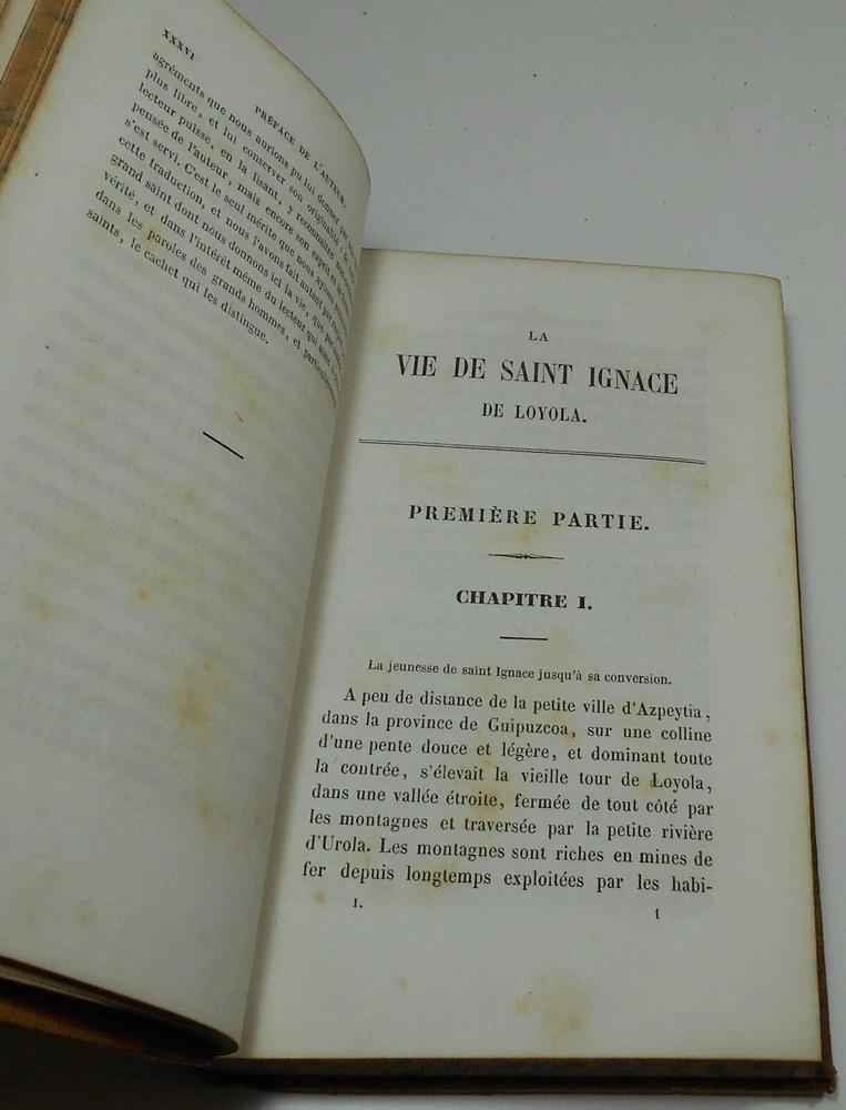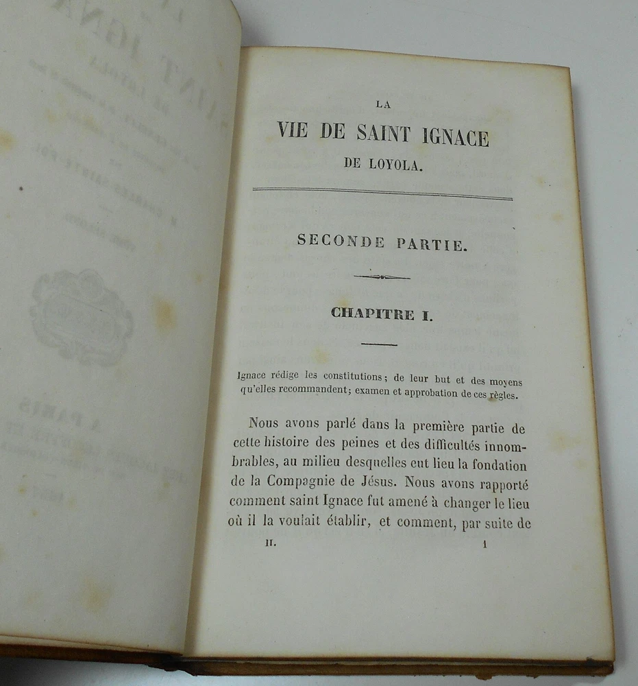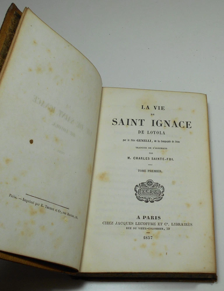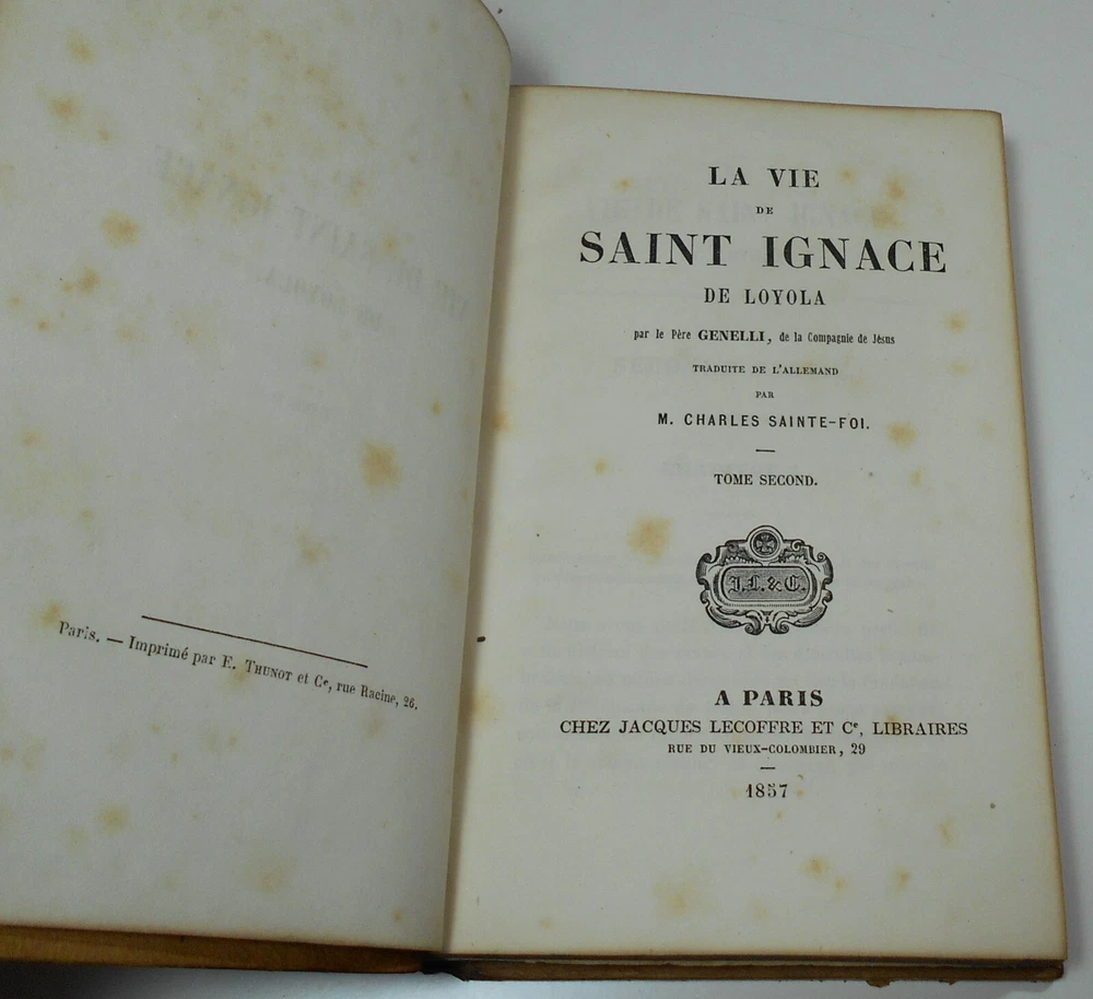 La Vie De Saint Ignace De Loyola Pere Genelli, de la Compagnie de Jesus, translated into English by M. Charles Sainte-Foi Chez Jacques Lecoffre et Cie, Libraires, Paris, 1857, complete in two volumes, 372 pages each, 4 1/2 x 7 inches. Full tree leather binding, marbled endpapers and page edges. Fair condition, leather with some wear and stains, hinges split and loose, with flaking leather at edges, front board of Vol. II held just by cords, scattered age spotting to text, no writing, bookplates or names. I pack all items very carefully, so they arrive in as good condition as when they leave! International bidders welcome! IMPORT DUTIES, TAXES AND CHARGES ARE NOT INCLUDED IN THE ITEM PRICE OR SHIPPING CHARGES. THESE CHARGES ARE THE BUYER'S RESPONSIBILITY. Please check with your country's customs office to determine what these additional costs will be, prior to bidding. Save on postage! Buy from my other auctions and reduce shipping costs! Your satisfaction is 100% guaranteed! If for any reason you are not happy with this item, please contact me within 14 days of receipt to arrange return and refund.