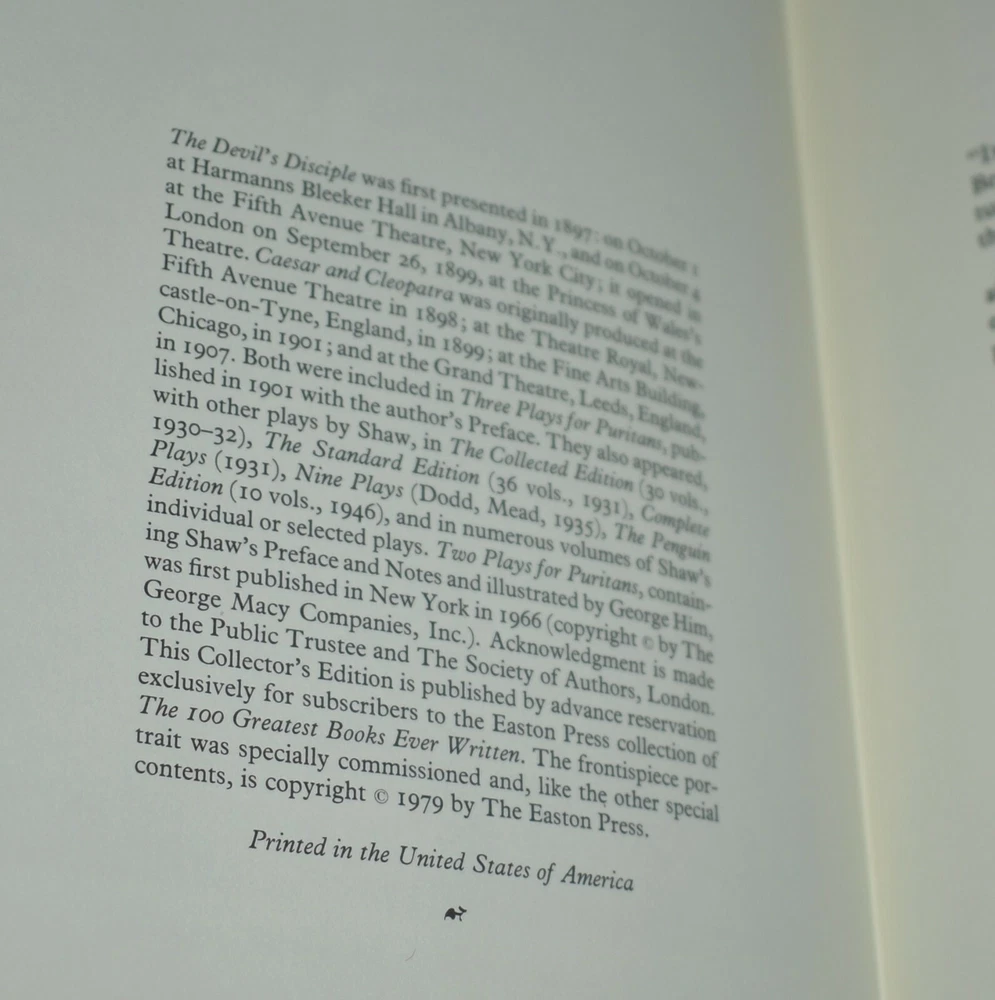 George Bernard Shaw TWO PLAYS FOR PURITANS Easton Press Leather Bound In great condition, bought then placed on my bookshelf for decades. Please see my many photos. Check out my many other listings, many more Easton Press books coming.