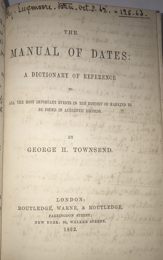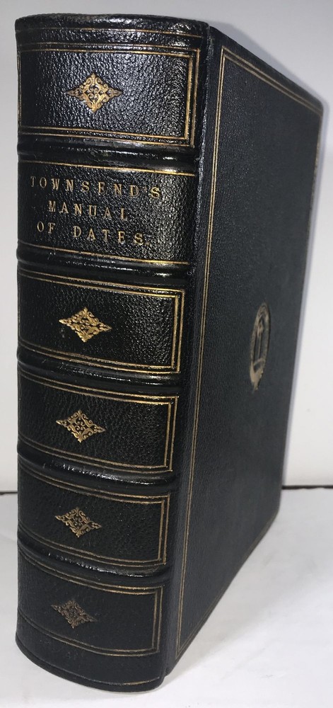 The Manual of Dates: A Dictionary of Reference (All the Most Important Events in the History of Mankind to be Found in Authentic Records) Author: Townsend, George H. Title: The Manual of Dates: A Dictionary of Reference (All the Most Important Events in the History of Mankind to be Found in Authentic Records) Publication: London: Routledge, Warne, & Routledge, 1862 Edition: 1st Edition Description: Full-Leather. Fine. Thick 8vo., (viii)957pp. Gorgeous First Edition bound in green pebble-grain morocco. 5 raised bands and 6 compartments, all with gilt borders. Titles stamped in gold in C2, gilt decorations in all others. Gilt borders and the armorial crest on the front board of the Luxmoore family with their motto, "Securis Fecit Securum", ("My Axe Saved Me"). (www.leshaigh.co .uk ; ). Marbled page edges and endpapers. Square, tight and very clean pages throughout and little or no wear. perhaps the tiniest of rubs to crown and tips but truly minor. Tiny closed tear on first blank end-paper. Contemporary annotations in beautiful script on first several prelims including a couple of preface pages. Certainly in the hand of a member of the Luxmore family with a notation of the name on the title page. Remarkably well-preserved particularly with a book of this size, A simply gorgeous collectable copy and uncommon as such. Seller ID: 008022 Subject: Antiquarian, Fine Binding/Decorative, Great Britain/London 35 Plus years buying and selling collectable books. Member ABAA, ILAB, IOBA. An eclectic mix of good books specializing in Sci-Fi, Mystery, General Antiquarian, Books About Books, Signed First Editions, Vintage Paperbacks, Modern Fiction and many, many others. Prompt, professional customer service, always! Please excuse any glare or reflections in the pictures. Books I know; photography not so much. I will answer any questions regarding condition if pictures are unclear. All books are stored in a temperature controlled library in a smoke free home. All books are professionally packed and shipped and all jacketed books will come with an archival Brodart jacket protector. Thank you for looking. Terms All orders ship within one business day. Standard mail is USPS Media Mail. We offer combined shipping on multiple orders. All items are guaranteed to be as described or they may be returned within 30 days of receipt for a full refund. This listing was created by Bibliopolis.