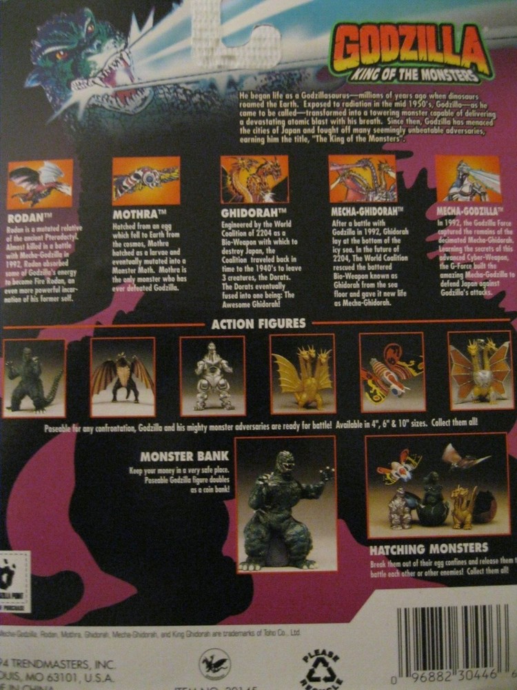 ONE-OWNER COLLECTABLE SMOKE-FREE HOME!! GODZILLA: KING OF THE MONSTERS : GHIDORAH HATCHED FIGURE. 1994 TRENDMASTERS, TOHO CO. Mint Figure, Egg and Trading Card still sealed in Blister package. Package shows some light corner/edge wear from being stored away for 30 yrs. Hanger hook is still in excellent condition with plastic reinforcement still attached. Please view all photos before Bidding. Thank You.