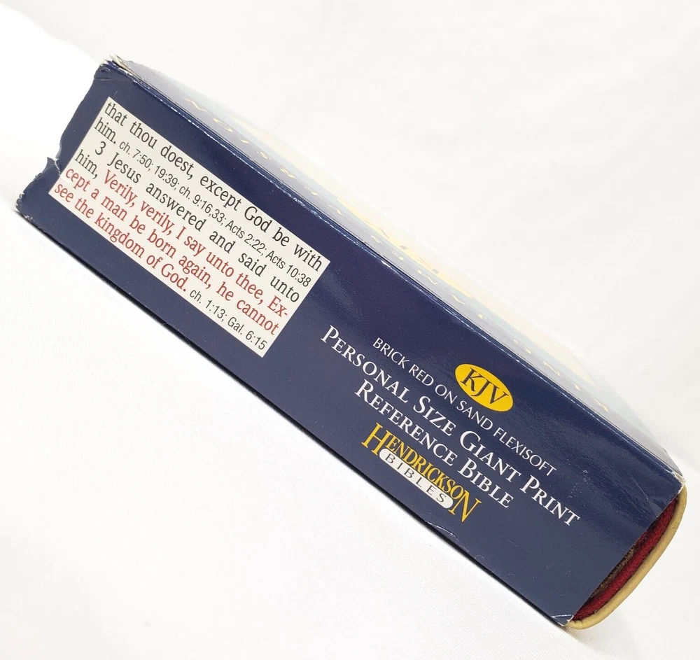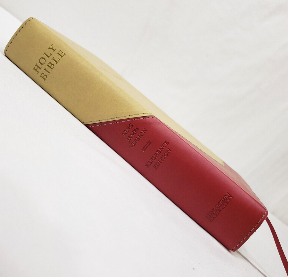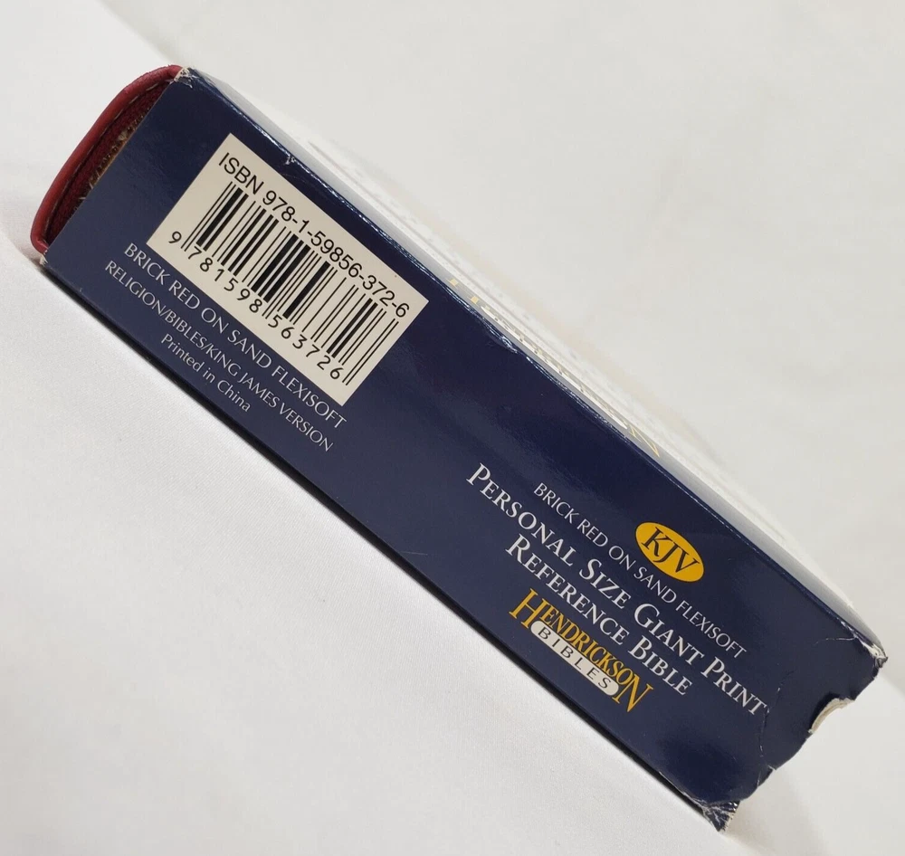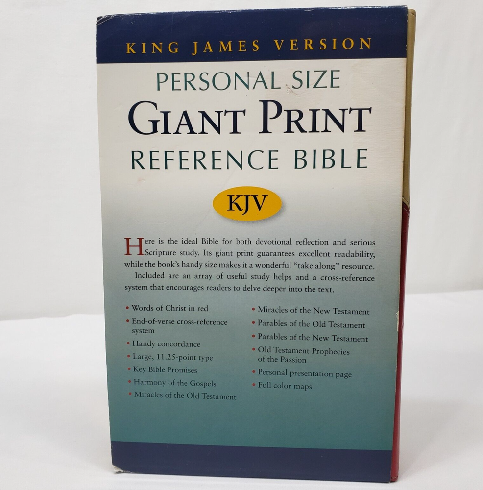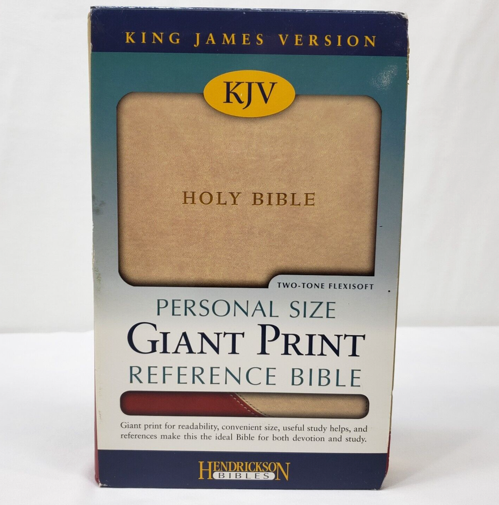 Personal Size Giant Print Reference Bible King James Version Study helps including words of Christ in red, concordance, parables, maps, and more Brick Red on Sand Flexisoft Imitation Leather Cover From Hendrickson Bibles Used with light wear. Cover and page edges have some light wear including marks, spots, and wear around edges and corners. Some pages have marks/creases.