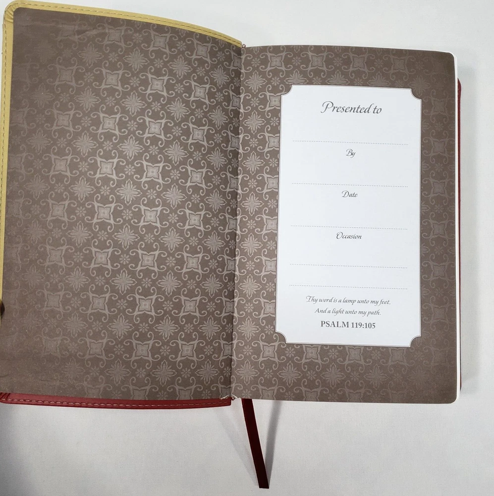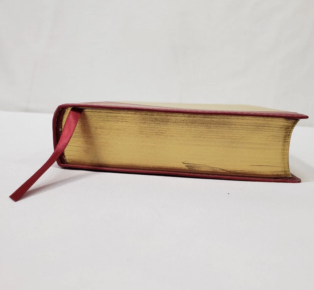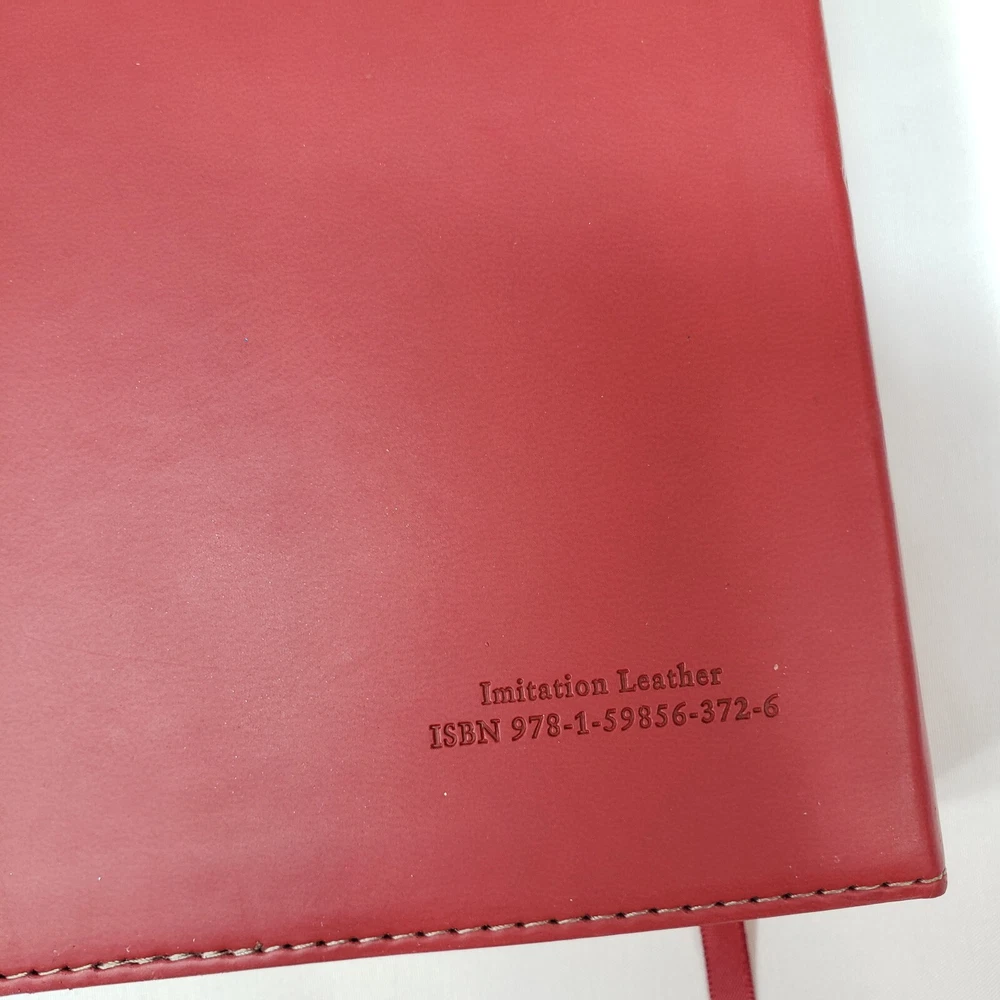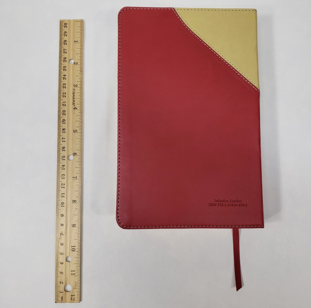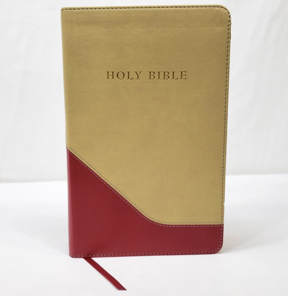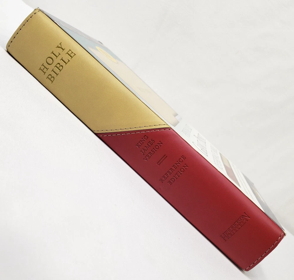 Personal Size Giant Print Reference Bible King James Version Study helps including words of Christ in red, concordance, parables, maps, and more Brick Red on Sand Flexisoft Imitation Leather Cover From Hendrickson Bibles Used with light wear. Cover and page edges have some light wear including marks, spots, and wear around edges and corners. Some pages have marks/creases.