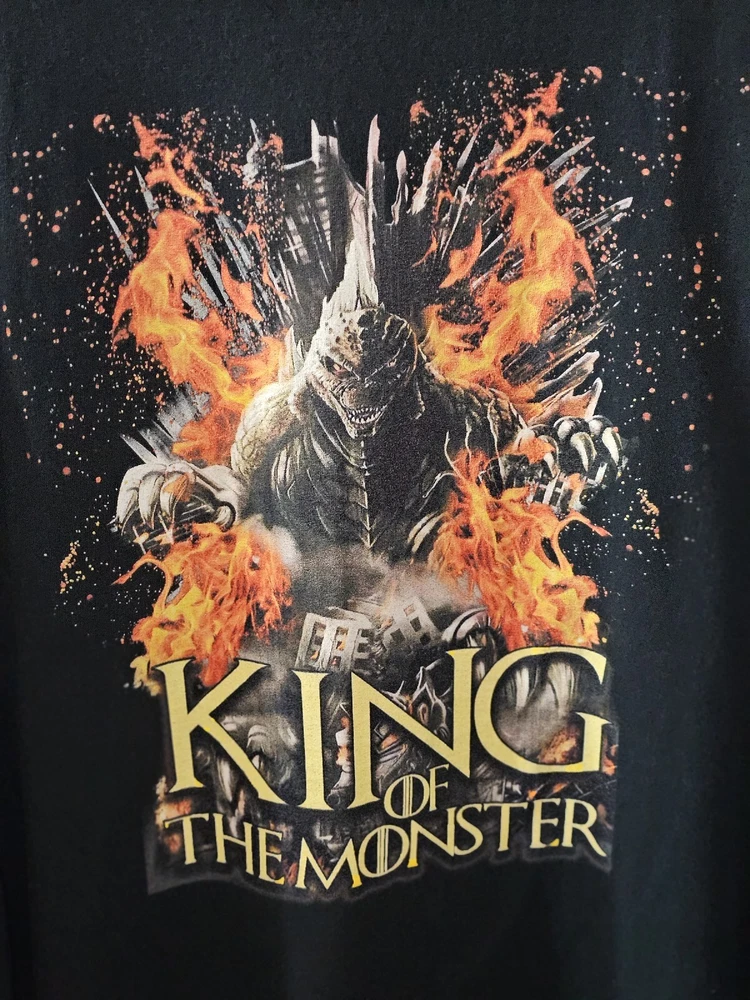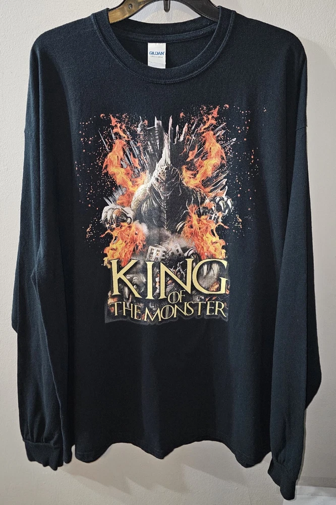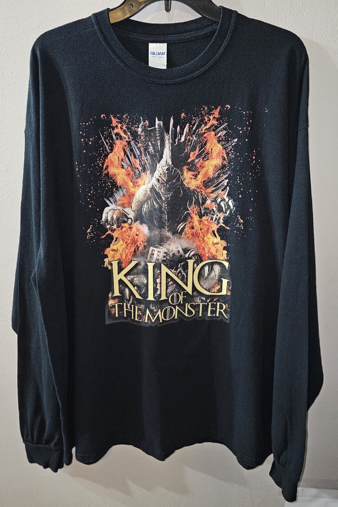 Show off your love for the iconic Godzilla with this Gildan long sleeve t-shirt. Featuring an animal print pattern and a graphic print of the King of the Monsters sitting on the fiery throne, this shirt is perfect for any fan of the movie. The crew neck and regular fit make it comfortable for everyday wear, while the cotton material ensures durability. The shirt comes in black, with a size of 2XL, and has long sleeves. With accents of the Fire Throne, this shirt is a must-have for any collector. Whether you're going for a casual look or trying to impress your fellow Godzilla fans, this t-shirt is sure to turn heads. 31 X 25