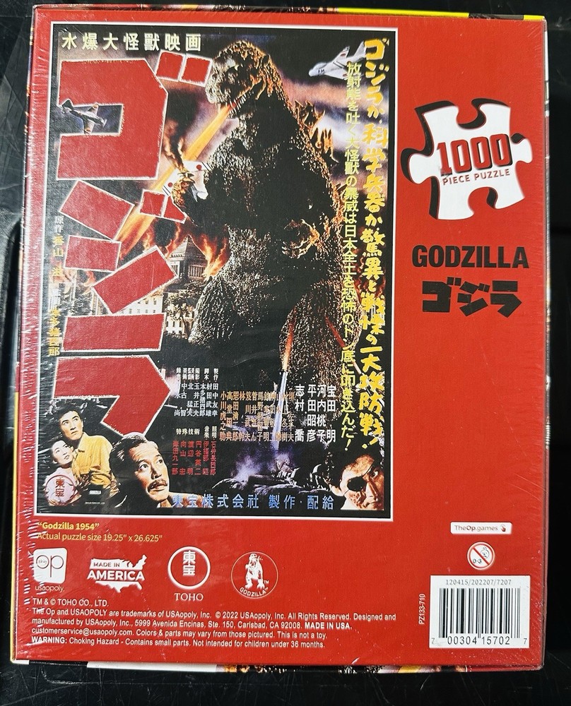 The Godzilla 1954 Jigsaw Puzzle with 1000 pieces by OP Puzzles is a brand new factory sealed toy that is perfect for fans of the iconic movie. The puzzle features a colorful design inspired by the classic Godzilla film, made of sturdy cardboard material. With a movie and TV theme, this puzzle is suitable for various age levels and is a great way to spend time and relax while putting together the pieces to complete the image of the legendary monster. Made in the United States, this puzzle is a must-have for any Godzilla enthusiast.