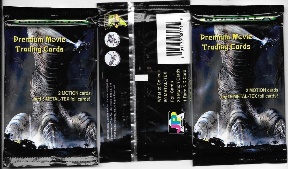 Godzilla 1998 Movie Two Premium Trading Card Packs Metal-Tex Foil Cards SEALED Godzilla 1998 Movie Two Premium Trading Card Packs Metal-Tex Foil Cards SEALED Released in 1998 by JPP Amada, this is the Godzilla movie trading cards. This is a set of two unopened, sealed packs with 5 Metal-Tex cards and 2 Motion cards per pack. We purchased these direct at the time of publication and they have been been stored in a smoke and pet free environment since. The photo is for identification but you will receive packs as described. Many have the remains of price stickers on them. We are adding hundreds of new items each month so check back often for our current auctions and our ebay store for other great items, including additional trading cards and other movie and TV merchandise. ADDITIONAL GODZILLA MERCHANDISE Click here GODZILLA for a complete listing of Godzilla Merchandise that we have available on EBAY ADDITIONAL TRADING CARDS!! Click here TRADING for a complete listing of trading cards that we have available on EBAY ADDITIONAL MOVIE AND TV MERCHANDISE Click here MOVIETV for a complete listing of movie and television material that we have available on EBAY You may combine this with our other auctions to save on total shipping costs, but we have to do the calculations as ebay cannot. Buyer pays a fixed shipping and handling fee for postage to a U.S. address which includes delivery confirmation. International shipments and other forms of delivery may be more. We will combine multiple auction wins to help reduce total shipping and handling fees whenever possible. To receive a combined shipping total (combined means reduced, not free) do the following: Click add to cart for the items you want; DO NOT click buy it now; when you have everything you want go to your cart and click the link to ask for total to the top right of your list if you are on a computer; if you are on your phone or a tablet, log in to ebay using a browser window; for Chrome touch the three dots in the lower right hand corner and look for the request stop site option; for Safari touch the AA in the upper left corner and look for the request desktop site option and for Firefox touch the three dots in the upper right hand corner and look for the request desktop site option; once you switch to the desktop site, go back to your cart and the request total from seller option should be visible; we then get that request and combine your orders to reduce the shipping and ebay then sends you a revised invoice to pay. Over 99% of all orders ship within one business day from the date of your payment. Let us know if you have special shipping options or needs. We are open Monday thru Friday (except holidays) from 9 am to 4 pm Eastern time. International buyers are responsible for any duties or customs fees. Please contact them if you feel they have billed you unfairly as we have no control over their assessment. Listing and template services provided by inkFrog
