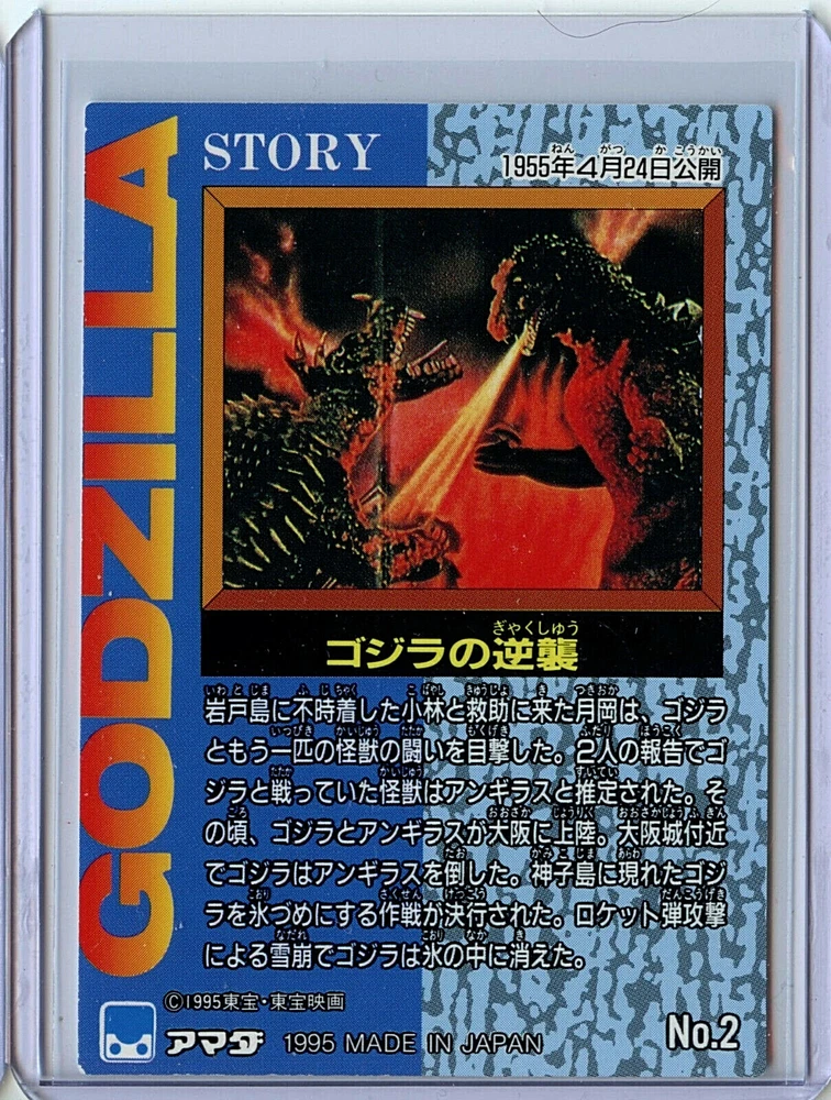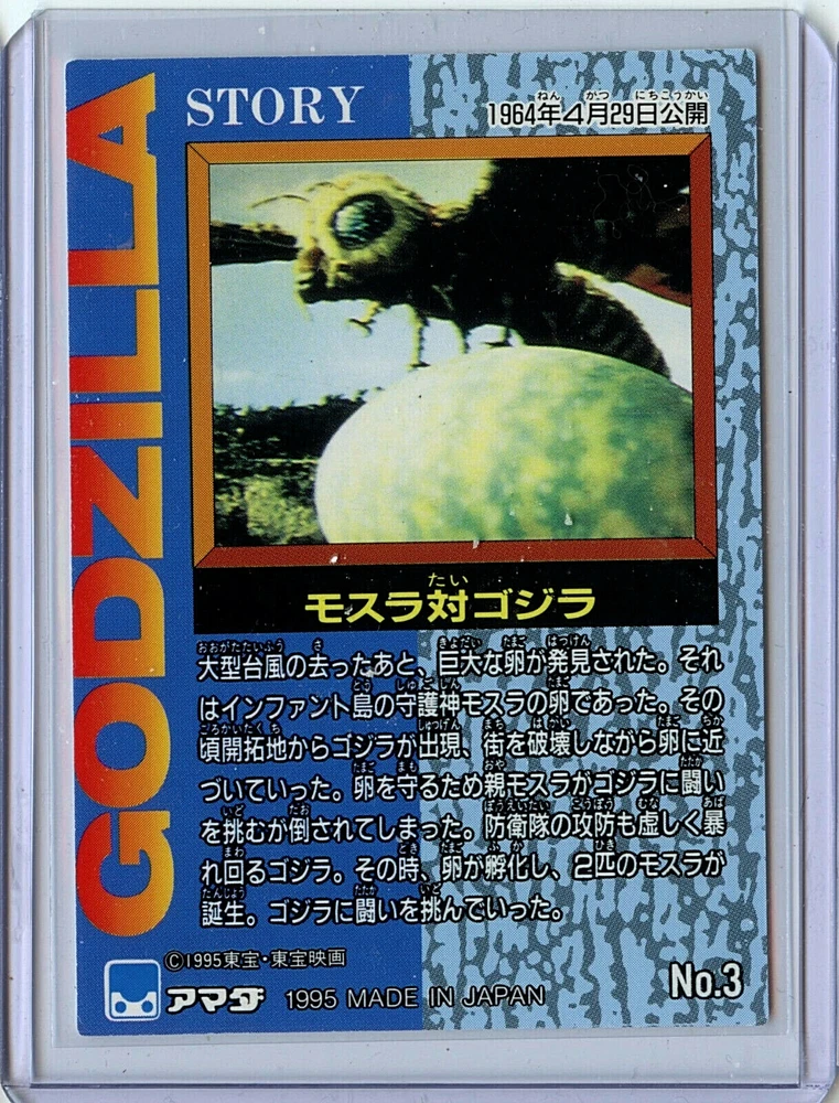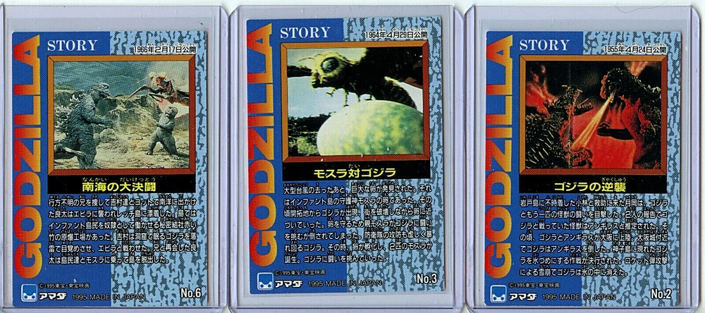You are buying 3 brand new Trading Collection 1995 Godzilla story Trading Cards. This lot includes card # 2, card # 3 and card #6. Printed in Japan in 1995. UPC Code is 4970381009731 (Japanese). Each card comes in a top Loader and pulled from a factory pack. PAYMENT & SHIPPING TERMS Payment is expected 1-3 days after the close of the transaction. We may elect to cancel the transaction and re-list this item if payment is not made within that time frame US BUYERS pay $ 6.99 for shipping within the 48 states. California residents please add sales tax. International shipping for this item is higher than shipping within the US. International buyers please make sure to inquire about shipping options to your address before making your purchase. INTERNATIONAL BUYERS . Shipping to international addresses costs more than shipping within the US. Please make sure to inquire about shipping costs before you make any purchase. We use insured priority airmail as our default shipping method. Customs duties and fees may or may not apply to imports to your country and may add an additional cost to the buyer for this item. These costs, if any, are the responsibility of the buyer. Please check with your individual country for any customs or duties. PAYMENT OPTIONS & TERMS: We accept PAYPAL. Please check our other items at our Ebay Store at: American Icons Collectibles We have many great items at our eBay store and we have hidden some real bargains for your viewing and shopping enjoyment. You can buy this item or many other great items now from our eBay store at: American Icons Collectibles Check out our other eBay auctions! Add Me to Your Favorite Sellers American Icons Collectibles selling Collectibles Since 1989 OUR BUSINESS HOURS ARE M-F 11-7 PST Closed Weekends & Holidays Search For Items At American Icons Collectibles Search titles and descriptions