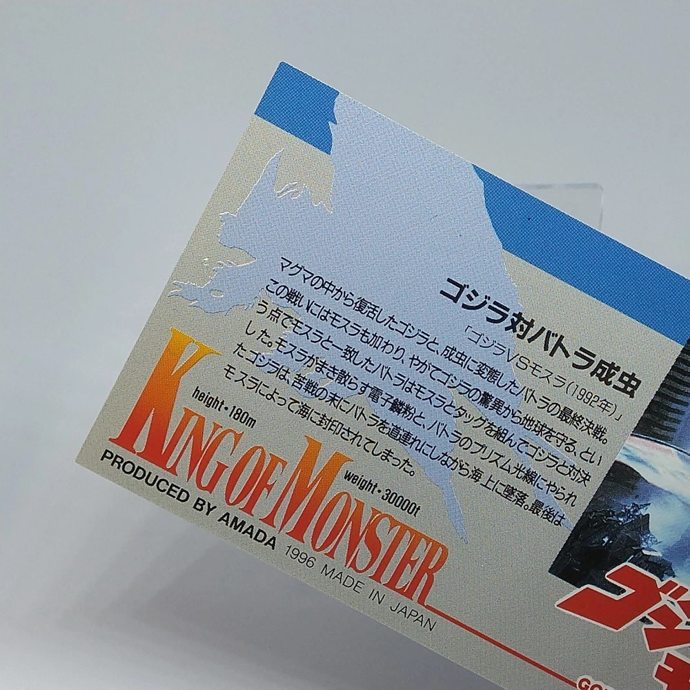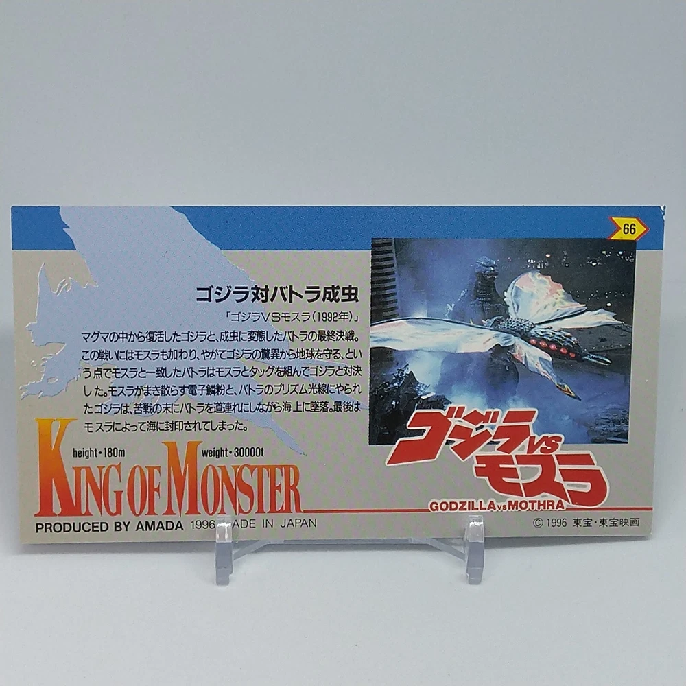 Godzilla Battra King of Monster Amada Wide Collection Trading Card No.66 1996 Description Please see the picture for the details of damages and dirt or ask us before your purchase. 100% Authentic or Money Back Guaranteed. (Do not worry you are protected by eBay and eBay Managed Payments) See the pictures for more details. If you have any question about the condition, accessories, or anything about the product, please feel free to message us. We are glad to answer all your concerns. Payment Same as ebay payment method. Shipping Economy shipping: Delivery time will be about 11 - 23 days. Standard shipping: Delivery time will be about 5 - 10 days. Expedited shipping: Delivery time will be about 1 - 4 days. Terms of Sale Money back guarantee within 30 days if returned by customer. We would not be able to accept your bid if you; 1) Don't have a PayPal account. 2) Have unpaid items reported. 3) Have a primary shipping address in countries you don't ship to. 4) Have reportedly violated eBay policies. 5) Have a Feedback score lower than the number you specify. International Buyers - Please Note: Import duties, taxes and charges are not included in the item price or shipping charges. These charges are the buyer's responsibility. Please check with your country's customs office to determine what these additional costs will be prior to bidding/buying. These charges are normally collected by the delivering freight (shipping) company or when you pick the item up - do not confuse them for additional shipping charges.