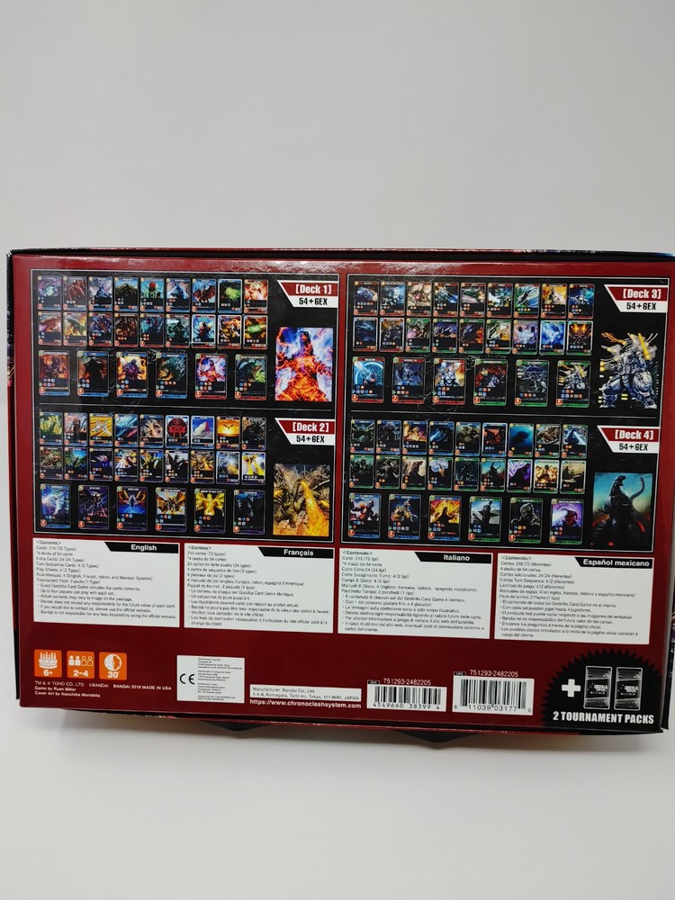 The "Godzilla Card Game Bandai CCG TCG Collectible Cards" is a deck-building game set in the "Chrono Clash" system, featuring 240 cards with a Godzilla theme. Manufactured by Bandai in Japan in 2019, this game is designed for players age 8 and up and includes 4 decks for tournament play. The cards are made of high-quality card stock and come in a standard size, allowing players to enjoy strategic gameplay with the Godzilla characters in English language. This collectible card game set offers an immersive experience for fans of Godzilla and card game enthusiasts alike.