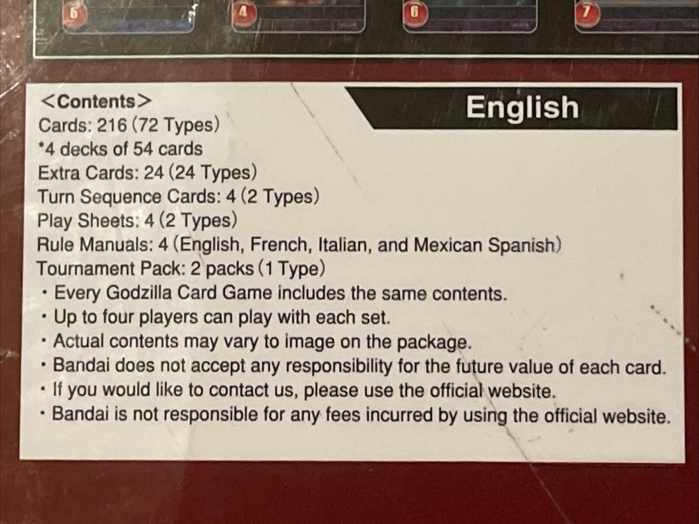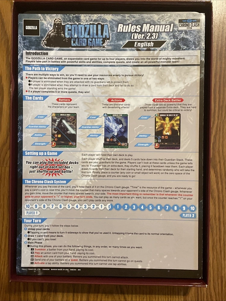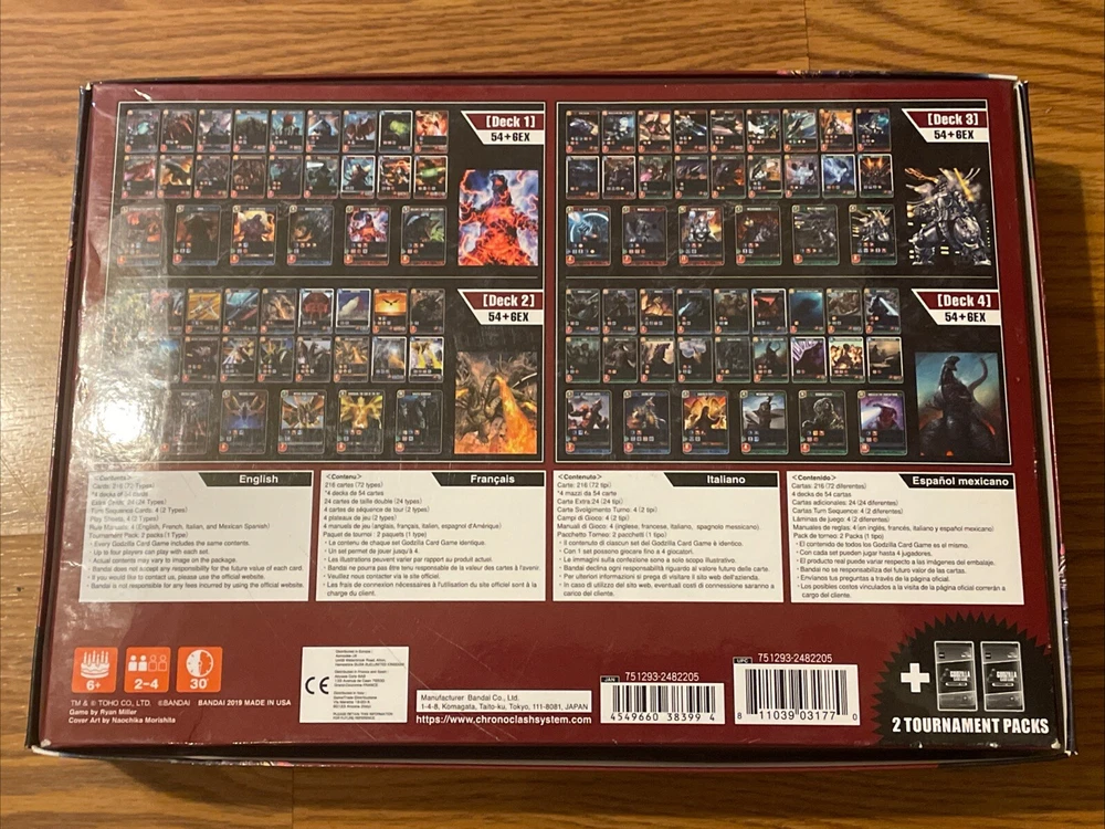*OPEN BOX, NEVER PLAYED, EXCELLENT/LIKE NEW CONDITION* *SET IS COMPLETE & ALL CONTENTS ARE INCLUDED* *FOR ADULT COLLECTORS* *RARE/LIMITED EDITION GAME SET* Experience the thrill of the Godzilla Card Game with this exciting set, featuring the iconic characters of Godzilla, Mothra, Rodan, Anguirus, King Ghidorah, MechaGodzilla, and various other Toho Kaiju. This strategy game is perfect for 2-4 players, with a play time of 30 minutes or less. The set includes four playable starter decks and two random tournament packs, each with the potential to contain rare and powerful cards. Every Godzilla Card Game set includes the same contents, with up to four players able to play with each set. The cards are made from high-quality card stock and paper, with a foil, holo, and regular finish. This collectible card game is suitable for ages 6 and up, and is available in English, French, Italian, and Mexican Spanish.
