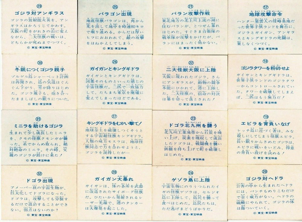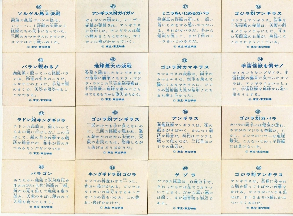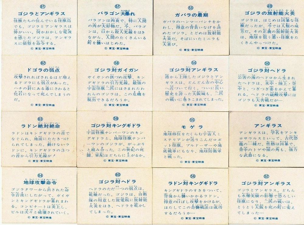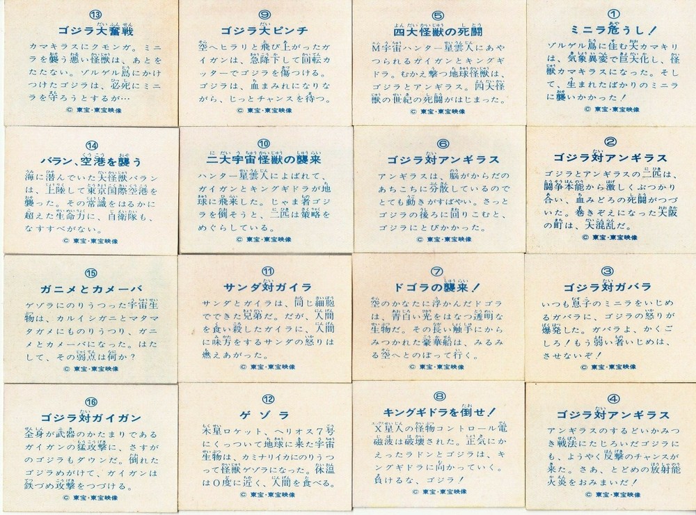 ■ DESCRIPTION ●lot of 64Full Complete This is a lot of 64 vintage Godzilla card is a card made by Yamakatsu of Japan in the 1970s. Card sizes are 5 cm x 6.7 cm (1.97 in x 2.6 in) each. The card is in a very good condition. ■ SHIPPING We will deliver it carefully using packing materials. ● Standard international shipping : DHL (within 1 week from shipping) USA, Canada, Australia, etc. ● Online tracking is available. If you would like to know the number of days of arrival in another country, please contact us. ■ Please note These charges are the buyer's responsibility. Please check with your country's customs office to determine what these additional costs will be prior to bidding or buying. Customs fess are normally charged by the shipping company or collected when you pick the item up. These fees are not additional shipping charges.