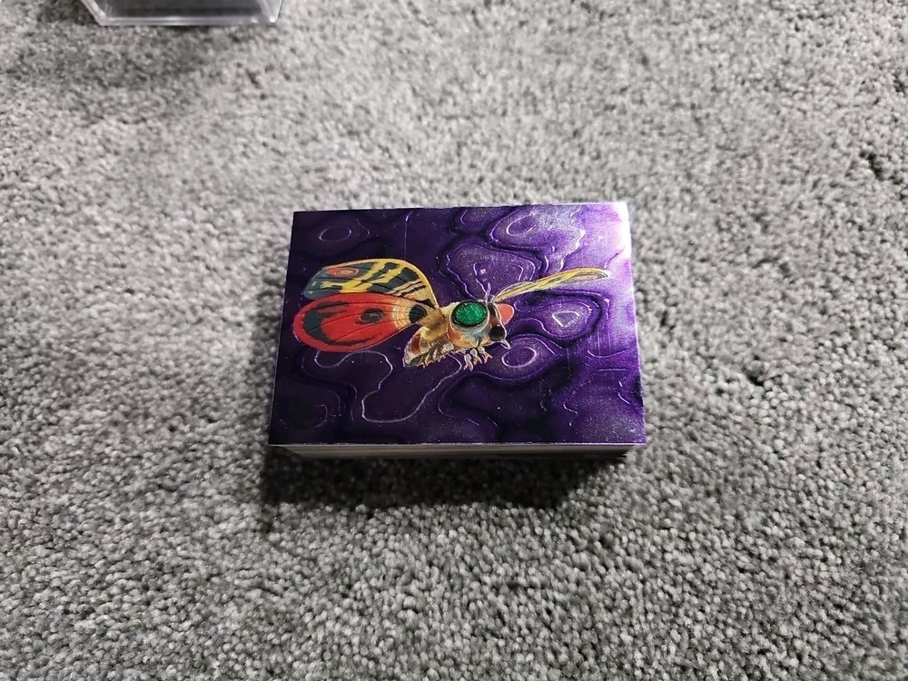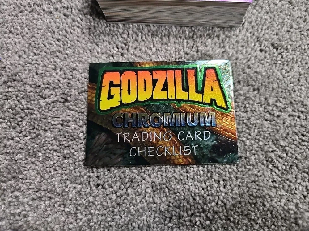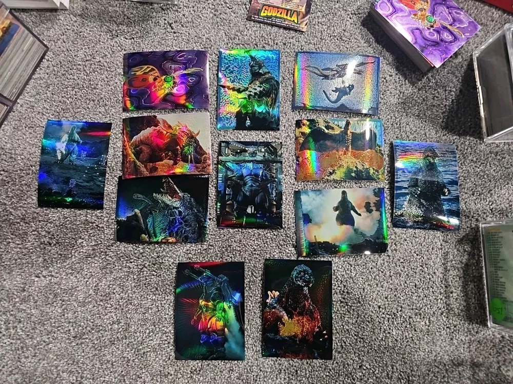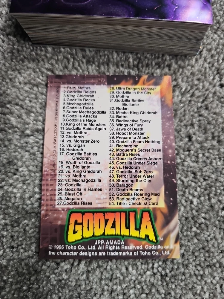 Base Set + 12 ultra rare stickers Acrylic case included This is a complete set of 54 Godzilla Chromium trading cards, featuring the iconic Japanese movie monster. The cards are made of high-quality chromium stickers and come with a checklist and parallel features. Additionally, this set includes 12 ultra-rare stickers that are sure to impress any collector. The cards are in standard size and were manufactured in Japan by JPP/Amada in 1996. They are perfect for fans of action, sci-fi, and TV & movies genres, as well as those who are 8+ years old. This set is an original and licensed reprint, making it a valuable addition to any collection.
