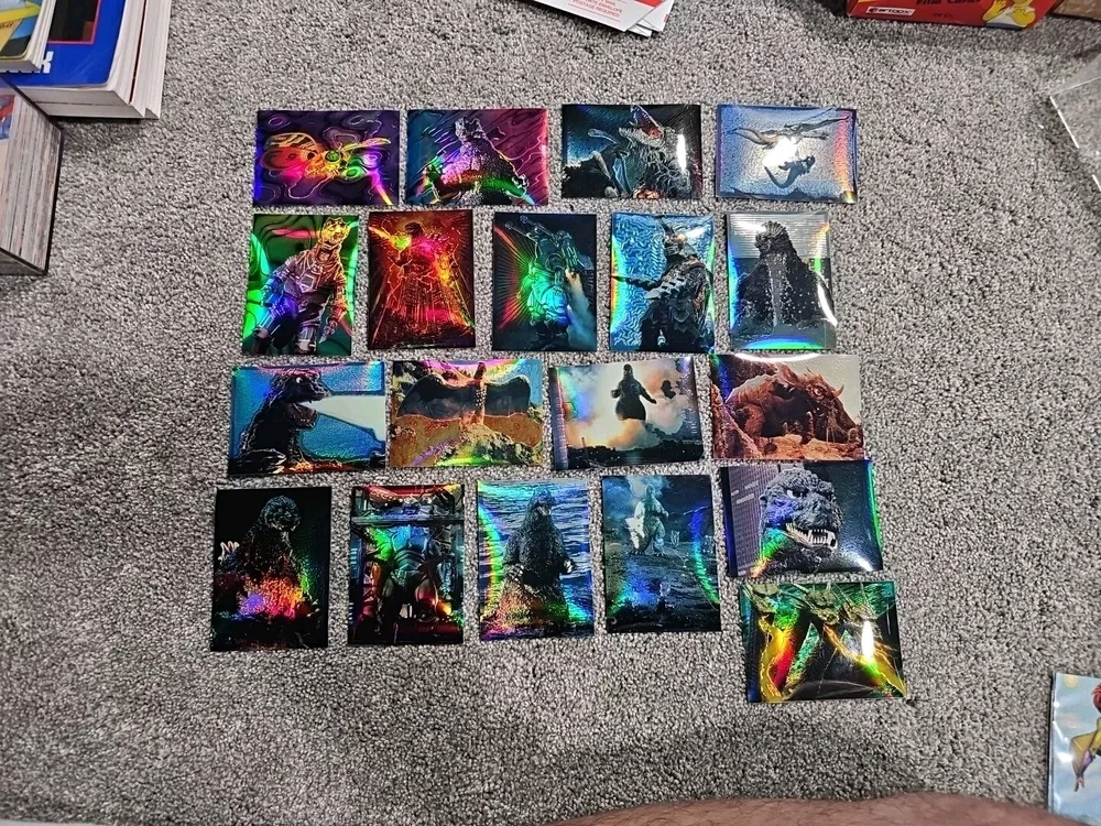 Base Set + 19 ultra rare stickers Acrylic case included This is a complete set of 54 Godzilla Chromium trading cards, featuring the iconic Japanese movie monster. The cards are made of high-quality chromium stickers and come with a checklist and parallel features. Additionally, this set includes 19 ultra-rare stickers that are sure to impress any collector. The cards are in standard size and were manufactured in Japan by JPP/Amada in 1996. They are perfect for fans of action, sci-fi, and TV & movies genres, as well as those who are 8+ years old. This set is an original and licensed reprint, making it a valuable addition to any collection.