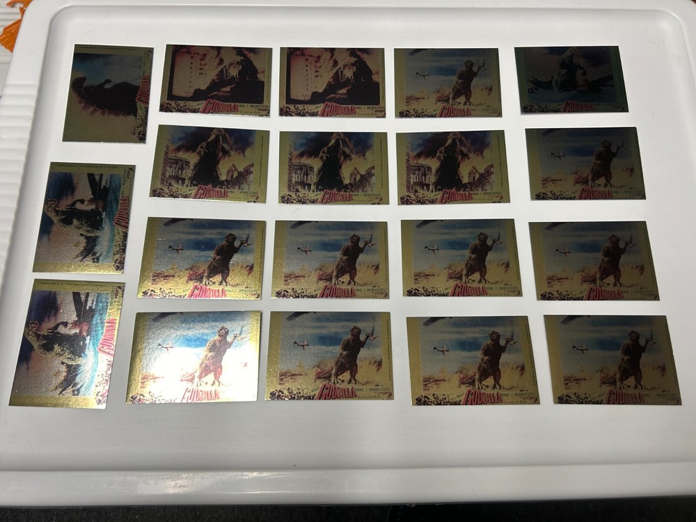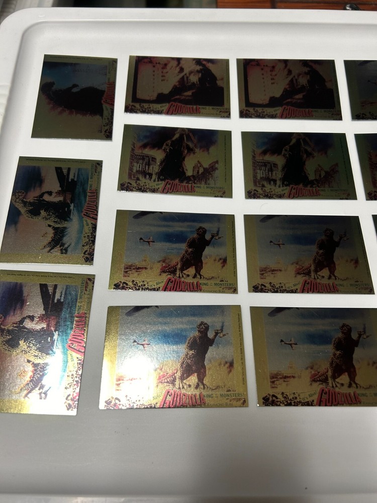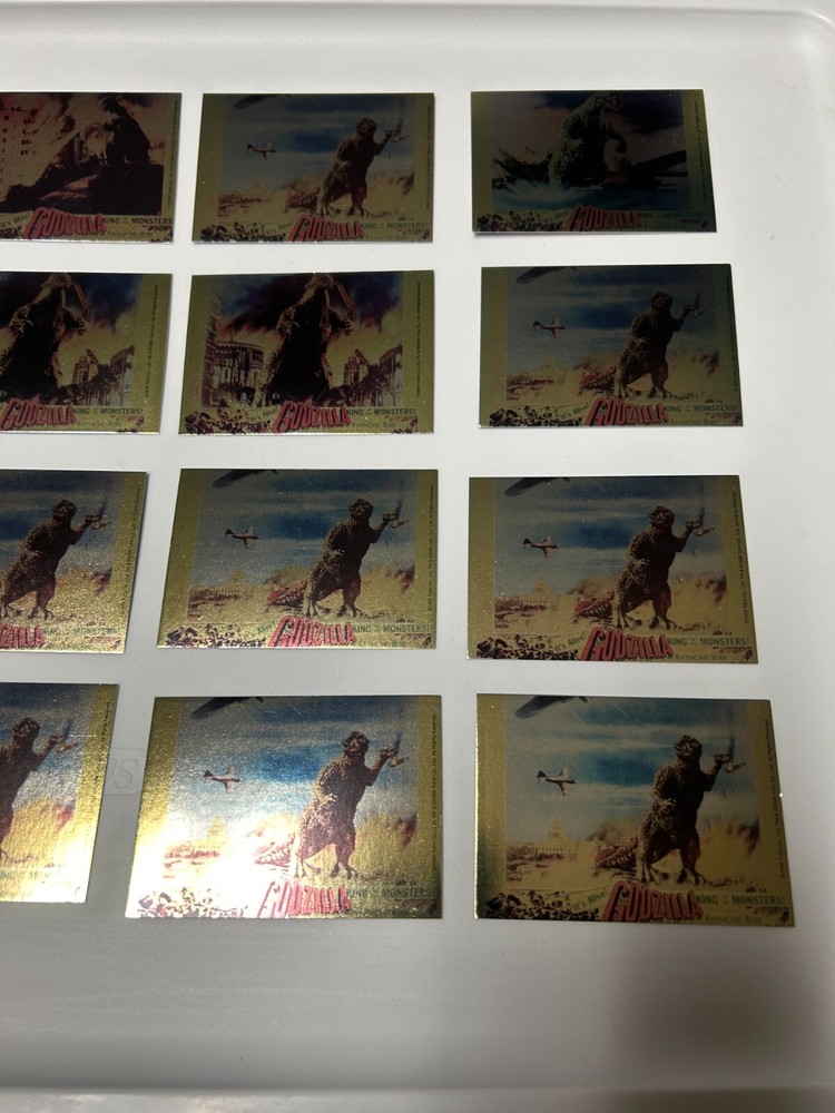 ITEM DESCRIPTION : This listing is for a gold puzzle card lot of Godzilla Cards from Comic Images. I believe these cards were from the early 2000's. You get all the cards that you see in the picture. I am not to familar with these cards these were from an estate find with other trading cards and ccg cards but if you have any questions I will do my best to answer them. All items are packed carefully when shipped. CONDITION: May have some minor shelf and storage wear. Cards may have some rough edges but I don't see any creases. SHIPPING/HANDLING RATES : USA SHIPPING / HANDLING with DELIVERY CONFIRMATION $9.95 SMALL BOX SORRY I WILL ONLY SHIP TO THE UNITED STATES. ADDITIONAL SHIPPING INFORMATION: Combined shipping is available on most items. If you are purchasing multiple items combined shipping is at my discretion. I will try to fit what I can in the same package. Shipping covers USPS fees, handling, and additional shipping material costs. PAYMENTS MUST BE RECEIVED IN 5 BUSINESS DAYS OR ELSE ITEM WILL BE RELISTED AND NEGATIVE FEEDBACK LEFT MAIL GOES OUT TWICE A WEEK, PLEASE ALLOW UP TO 3-7 BUSINESS DAYS FOR YOUR ITEM TO BE PROCESSED PLUS USPS SHIPPING TIME. WE ARE NOT RESPONSIBLE FOR ANY ITEMS LOST OR STOLEN ONCE SHIPMENT IS MADE. WE WILL LEAVE FEEDBACK(S) AFTER TRANSACTION IS COMPLETE AND BUYER HAS LEFT US FEEDBACK SO WE KNOW ITEM AS ARRIVED SAFELY. I RESERVE THE RIGHT TO CANCEL BIDS OR END AN AUCTION AT ANY TIME, IF I SUSPECT FRAUD OR A BAD TRANSACTION. THERE ARE ABSOLUTELY NO RETURNS MAKE SURE YOU WANT THE ITEM BEFORE YOU BID, BUY IT NOW, OR MAKE AN OFFER. MAKE SURE YOU ASK ANY QUESTIONS BEFORE YOU BUY THE ITEM ALSO. I'VE BEEN ON HIATUS FOR A FEW YEARS AND I AM NOW LOOKING FORWARD TO RESUMING BUSINESS ON EBAY. I HAVE ALWAYS HAD VERY GOOD FEEDBACK SO IF YOU ARE NOT HAPPY ABOUT A TRANSACTION FEEL FREE TO CONTACT ME BEFORE LEAVING FEEDBACK. PURCHASES WILL ONLY BE SENT AFTER PAYMENT CLEARS. GOOD LUCK AND THANKS FOR BIDDING AND PURCHASING.