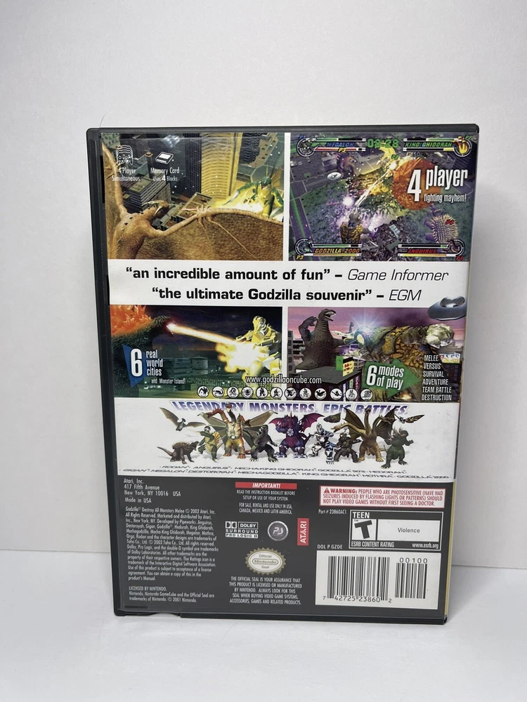 Experience the ultimate fighting game with Godzilla: Destroy All Monsters Melee for Nintendo GameCube. This complete CIB (Complete In Box) game comes with the original manual and has been thoroughly tested for hours of fun gameplay. Join the battle and take on the powerful Godzilla in this T-Teen rated game. With a region code of NTSC-U/C (US/Canada) and released in 2002 by Atari, this game is perfect for any collector or fan of the fighting genre. The game features manual included and offers a thrilling experience for gamers. Get ready to destroy all monsters and save the world in this Godzilla: Destroy All Monsters Melee game. Please review all pictures for details and specs of the games condition. Game has been tested and works. The disc is in very good condition. Few surface scratches if you have any questions, please message me or refer back to the pictures. Thank you.