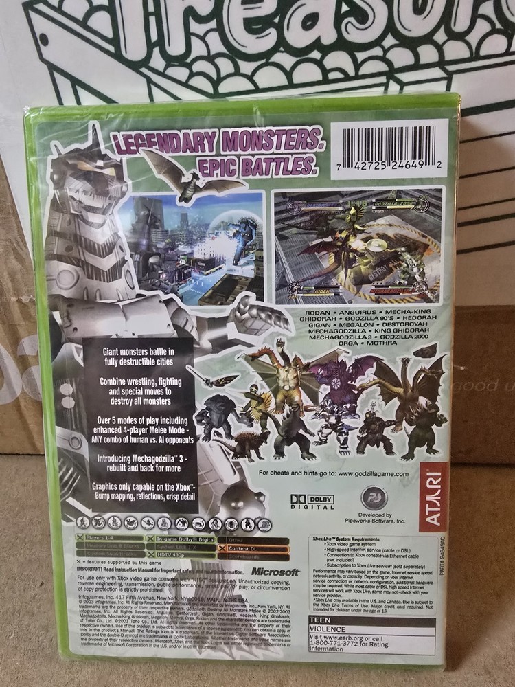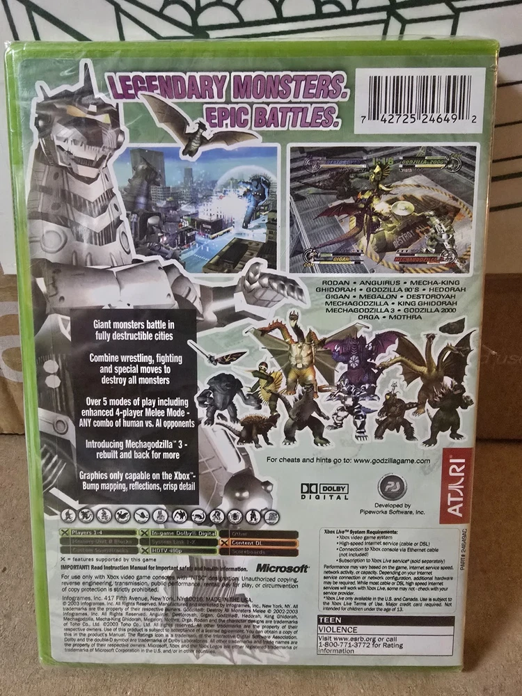 After conquering the GameCube, Godzilla lumbers onto the Xbox in a four-player 3D brawler starring over 14 monsters from Toho Co. Ltd.'s famous movie series. Godzilla is pitted against such enemies as Mothra, King Ghidora, Mechagodzilla, and more as they fight amidst the chaos of Tokyo, San Francisco, Seattle, Monster Island, and six more environments. Populated regions will send out armies in an attempt to prevent their cities from being ravaged by the hulking beasts. <br><br>Details such as moving vehicles, working traffic lights, and more help bring the locales to life, and destructible objects allow for pieces of crumbling buildings to be used as weapons. Basic moves include punches, kicks, jumps, and throws, while more advanced techniques involve using each character's special powers to perform deadly combination attacks. Players can also use the environment to their advantage while fighting, as human armies will focus their efforts on the creature causing the most damage to the city.<br><br>In addition to a Story Mode, which involves battling each monster in succession until the player is victorious, Godzilla features a number of other play options. Modes include Versus, where up to four monsters can fight at once; Destruction, which has players smashing as many things as possible within a time limit; Survival, a test of endurance as players fight as many enemies as they can without losing a match; and Practice, where players can familiarize themselves with each creature's moves and powers.<br><br>Xbox-specific features include the addition of Mechagodzilla 3, two new arenas, computer-controlled combatants in both four-player melee and team games, and an option to play Destruction Mode alone. New arenas consist of the Vortaak Home World and a giant Boxing Ring. The former features volcanoes, alien structures, spaceship launchers, and more, while the latter offers ropes, bells, and blimps in what is described as the "largest boxing ring in the world constructed for monster battles." Other enhancements include upgraded visuals with bump-mapping, high-resolution textures, and other special effects, as well as support for custom soundtracks.