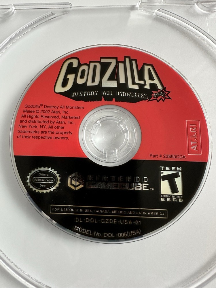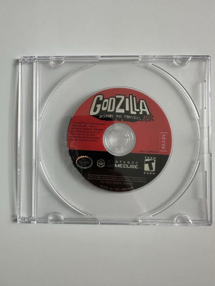 Godzilla: Destroy All Monsters Melee This is a game disc of Godzilla: Destroy All Monsters Melee for the Nintendo GameCube. This game can be played on any of the Nintendo GameCube consoles, as well as any GameCube compatible Wiis. This is a 100% authentic game of Godzilla: Destroy All Monsters Melee. This game has been tested and shown to work. This game disc will also come with a protective game case as shown in the photos. The disc art is in very good shape with very minimal signs of use/ wear, as shown in the photos. The bottom of the disc is also in very good shape with very minimal signs of use/ wear. These signs of use/ wear did not affect gameplay as the game has been shown to work and was completely playable. This game is being sold AS-IS, which means it is being sold exactly in the same condition as shown in the photographs, and is being sent in the exact same condition as shown as well. Photos are taken the day the listing is created and posted. GODZILLA: DESTROY ALL MONSTERS MELEE GAME DISC WITH PROTECTIVE GAME CASE ONLY.