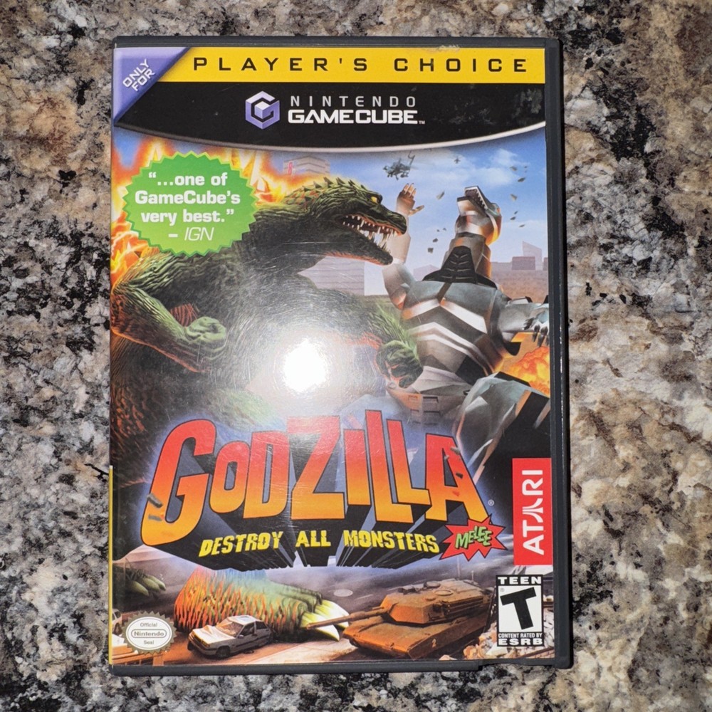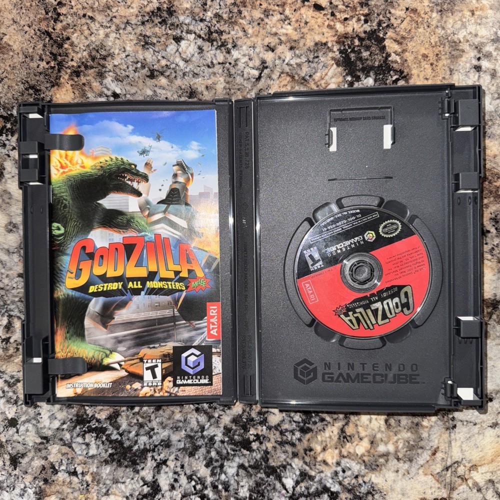 The product is Godzilla: Destroy All Monsters Melee for the Nintendo GameCube, released in 2002. This fighting game is part of the Godzilla video game series and features a unique twist with a boxing sub-genre. Published by Atari, the game includes multiplayer mode, a manual, and is rated T-Teen. The black label version adds to the collectibility of this NTSC-U/C (US/Canada) region game. Perfect for fans of Godzilla and fighting games alike, this game offers an exciting and engaging gaming experience on the GameCube platform.