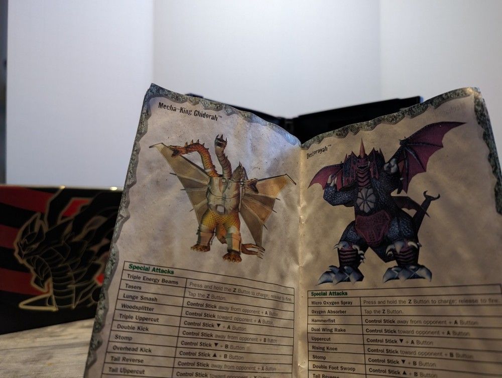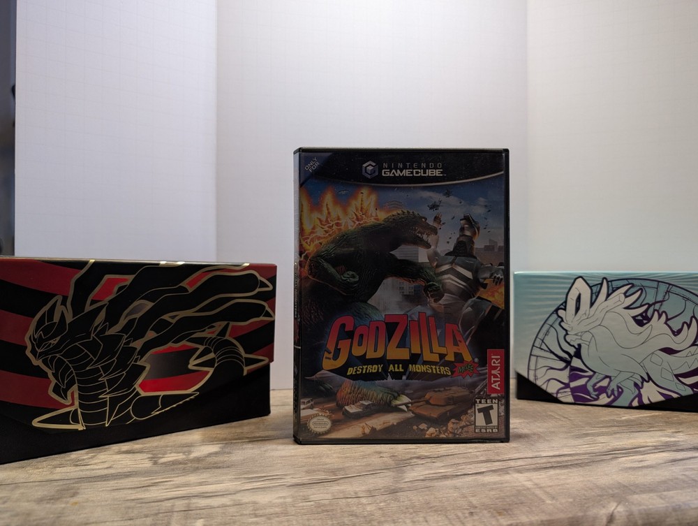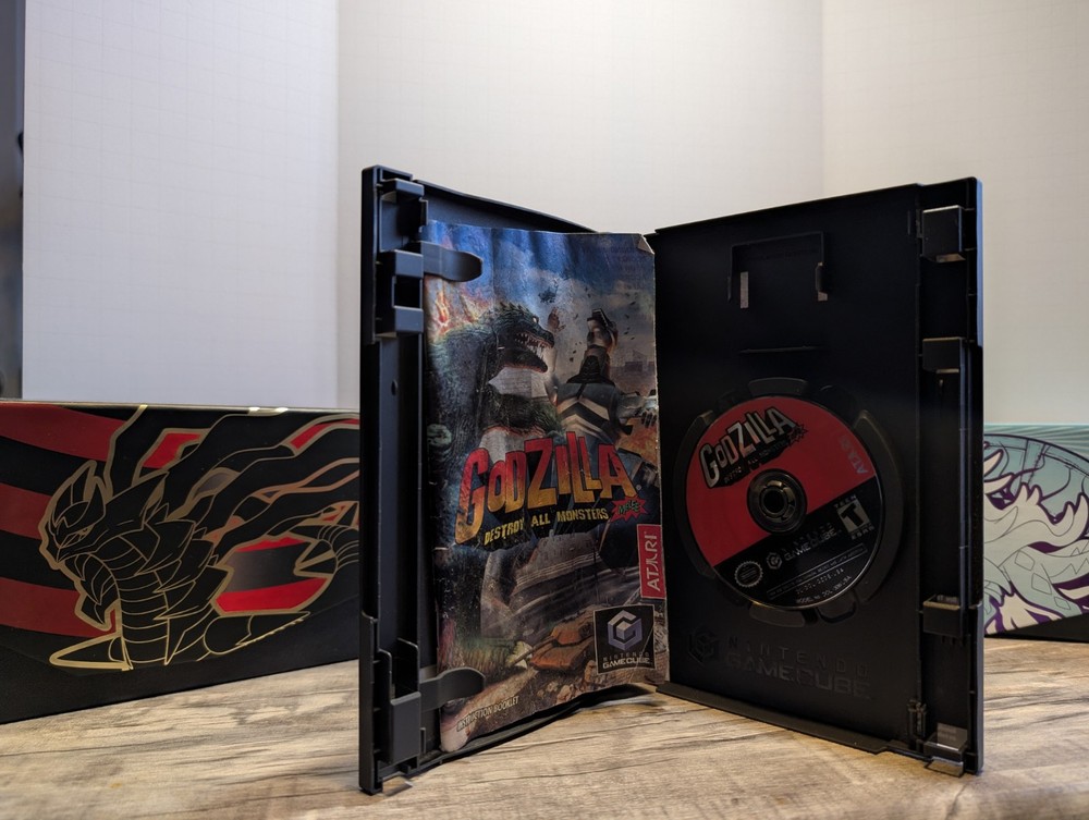 Cib game has some scratches. Been play. Tested manual has a lot of water damage throughout the whole book 📖 front page is stuck together but the rest of the pages are apart Godzilla: Destroy All Monsters Melee is a fighting game released in 2002 for the Nintendo GameCube console. Published by Atari, the game features Godzilla and other monsters battling it out in various locations. It is rated T for Teen and follows the NTSC-U/C (US/Canada) region code.
