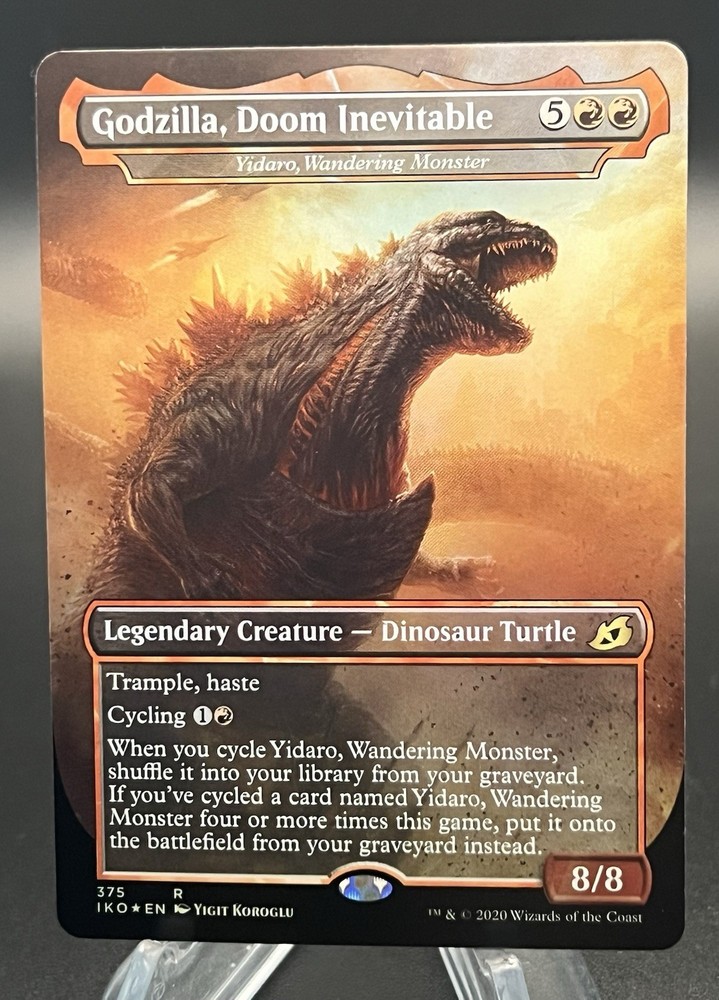 Step into the world of monsterverse battles with the "Godzilla, Doom Inevitable" card from the Ikoria: Lair of Behemoths set. This captivating non-sport trading card, illustrated by Yigit Koroglu, showcases Yidaro, Godzilla, and other iconic characters in a stunning foil variety that adds a shimmering finish to your collection. The card, numbered 375, is an original release by Wizards of the Coast and features English text suitable for players aged 13 and up. Whether you're a seasoned collector or just starting, this card stock piece from 2020 is a must-have for fans of the Godzilla franchise and Magic: The Gathering enthusiasts alike.