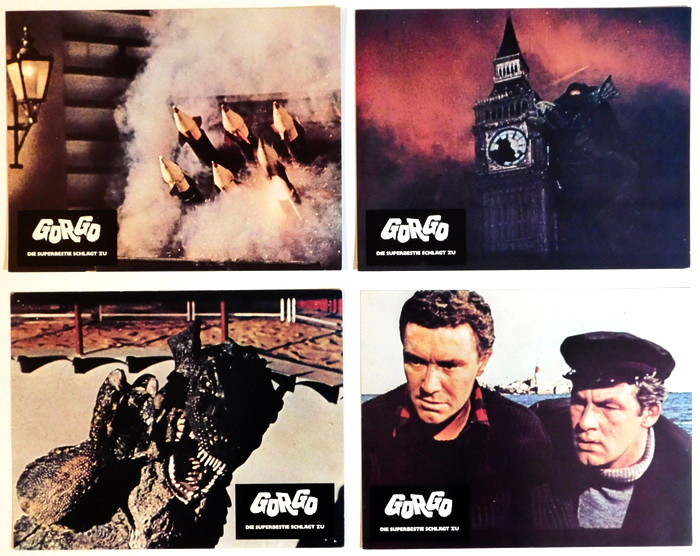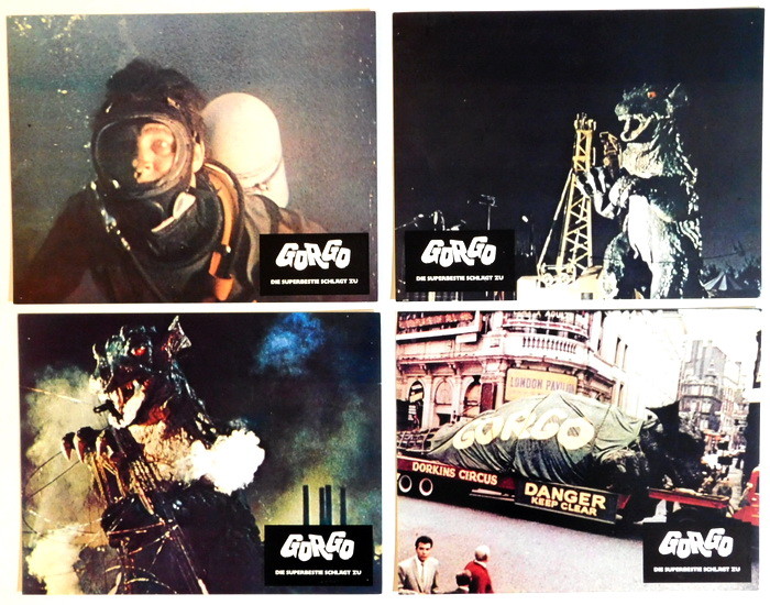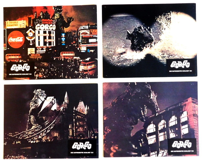 These are no reproductions, we sell ORIGINAL MATERIAL provided by the german distributor We offer here a original german movie lobby card set - 20 different lobby card stills from the movie : GORGO original vintage re-release cards from 1973 Gorgo, the 1961 Eugene Lourie English London kaiju battling rubbery monsters dinosaur horror science fiction (sci-fi) thriller ("Like nothing you've ever seen before!"; "The greatest monster picture ever produced!"; "This is the big one!"; "Original Story by Eugene Lourie and Daniel Hyatt") starring Bill Travers, William Sylvester, Vincent Winter, Bruce Seton, Joseph O'Conor, Martin Benson, Barry Keegan, Dervis Ward, and Christopher Rhodes size of each card is approx.: 9 x 12 inches / 24 x 30 cm item condition: C8 / pinholemarks condition evaluations : near mint (C9-10): Generally unused in perfect condition, may have the slightest of storage wear. very fine (C8-9): Can have minimal wear / signs of use (small pinhole marks, some border or small fold tears) fine (C7): A card with some general usage wear such as some border tears, pinhole marks, or tape marks. Not severe, still fine for presentation (framed) or for collecting in general. very good (C6): A used card with some of the following defects: pinholes, tears, wrinkling, tape marks, stains, or minor paper loss (crossfolds or corner chips) may occur. good (C4-5): Significant wear or signs of usage. Possible paper loss, tape, tears, stains, or fragile paper in general, or writing on front. May still be presentable if framed or needs to be restored/backed. fair (C3-4): Below average, major defects. material will be SHIPPED in an envelope with cardboard included and an extra foil