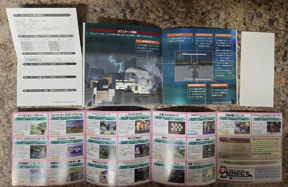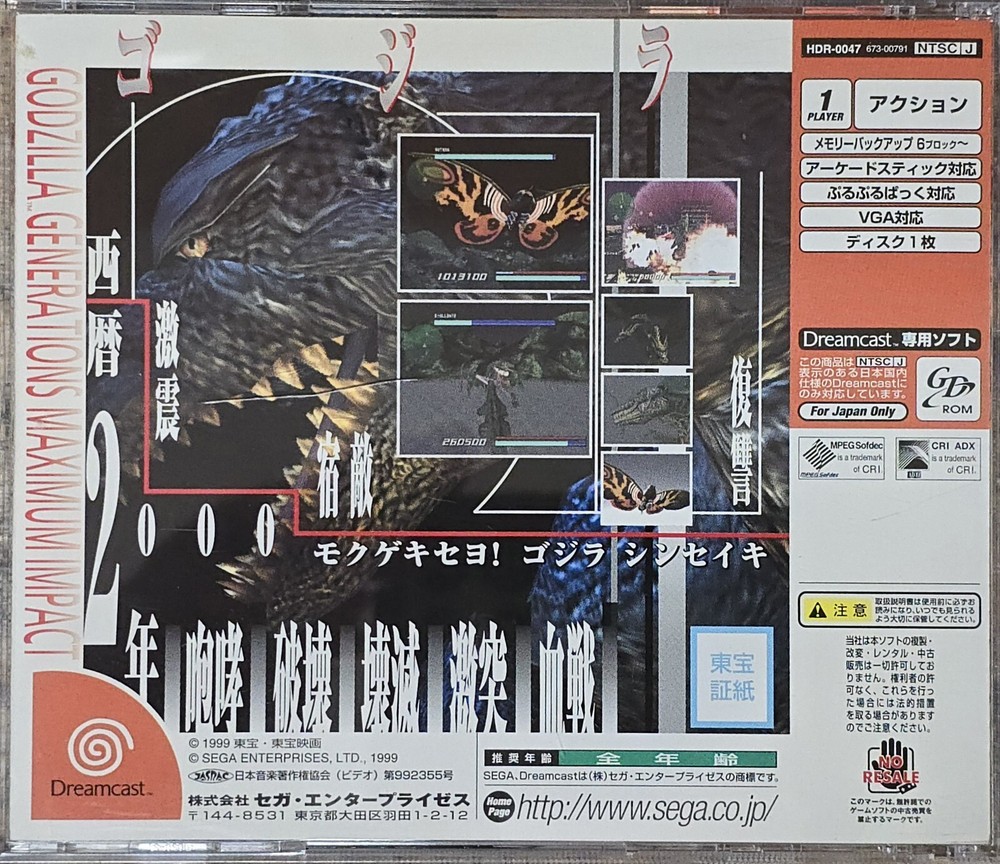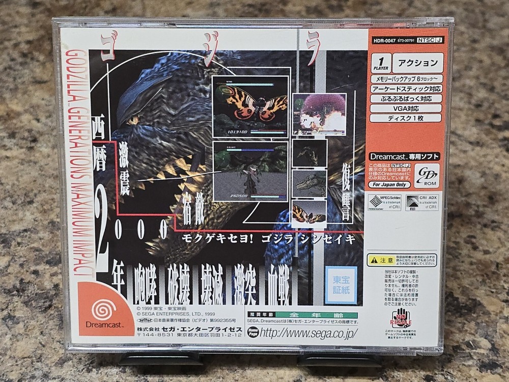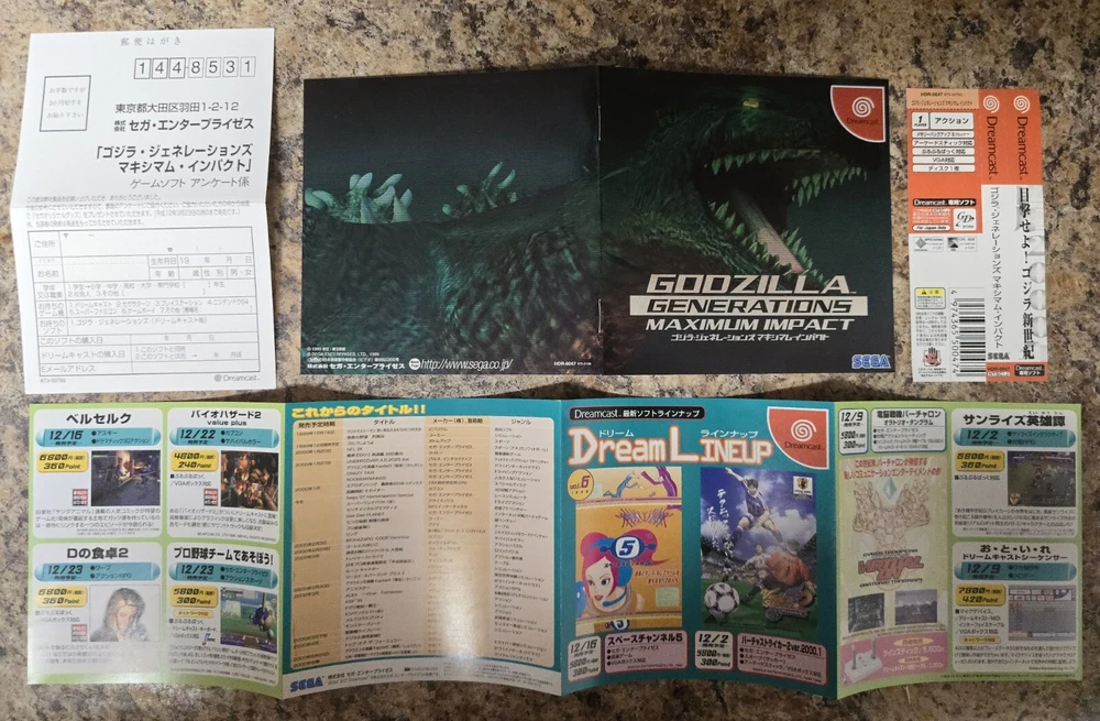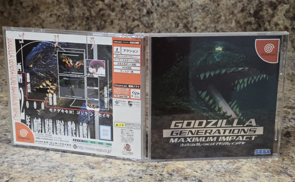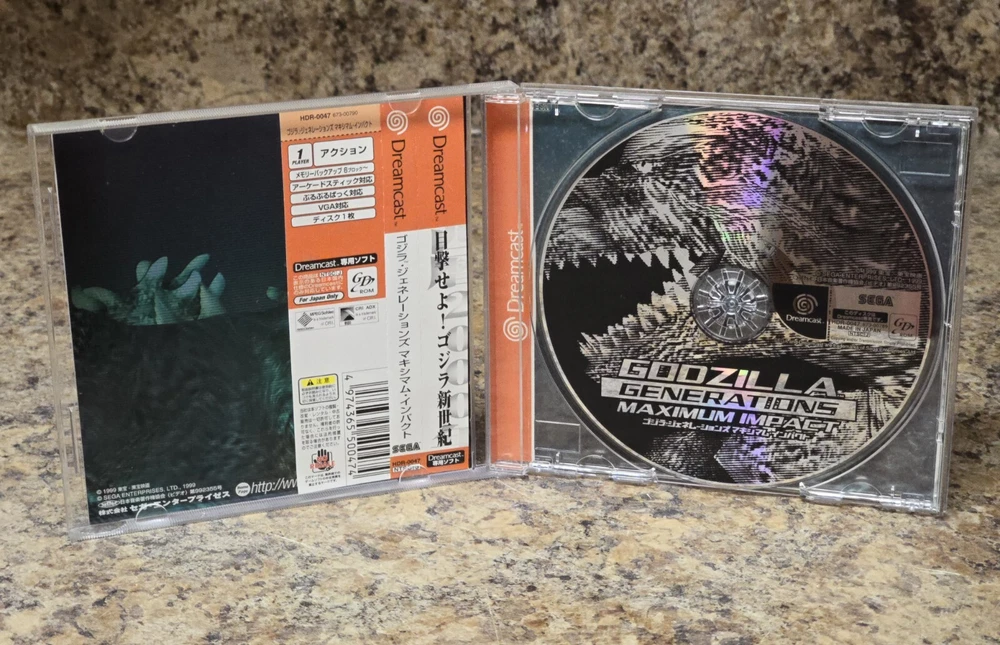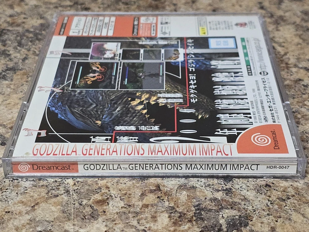 Godzilla Generations Maximum Impact (Japan Import) for the Sega Dreamcast System is authentic, complete, and in good working order. Included items are game disc, manual, registration card, spine card, insert, and the original case with back cover art. The manual has some imperfection, and the back of the case has a crack. Please see the photos.