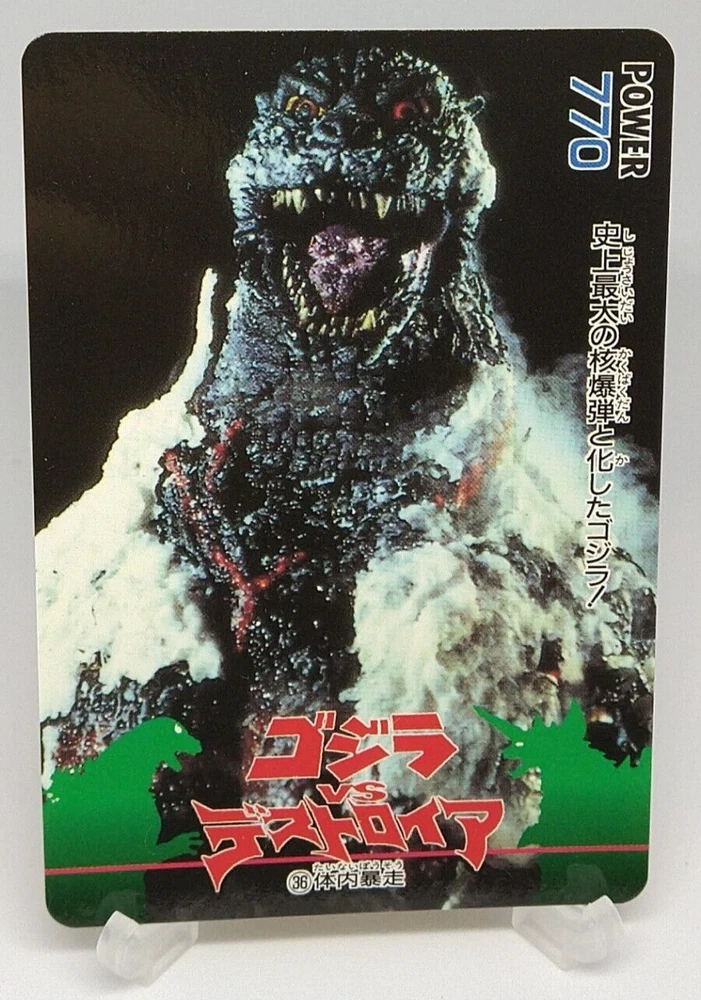 Godzilla Godzilla vs Destoroyah Trading Card No.36 AMADA Japanese 1995 Toho Description Beautiful Please see the picture for the details of damages and dirt or ask us before your purchase. 100% Authentic or Money Back Guaranteed. (Do not worry you are protected by eBay and eBay Managed Payments) See the pictures for more details. If you have any question about the condition, accessories, or anything about the product, please feel free to message us. We are glad to answer all your concerns. Payment Same as ebay payment method. Shipping Economy shipping: Delivery time will be about 11 - 23 days with tracking number. Standard shipping: Delivery time will be about 5 - 10 days with tracking number. Expedited shipping: Delivery time will be about 1 - 4 days with tracking number. Terms of Sale Money back guarantee within 30 days if returned by customer. We would not be able to accept your bid if you; 1) Don't have a PayPal account. 2) Have unpaid items reported. 3) Have a primary shipping address in countries you don't ship to. 4) Have reportedly violated eBay policies. 5) Have a Feedback score lower than the number you specify. International Buyers - Please Note: Import duties, taxes and charges are not included in the item price or shipping charges. These charges are the buyer's responsibility. Please check with your country's customs office to determine what these additional costs will be prior to bidding/buying. These charges are normally collected by the delivering freight (shipping) company or when you pick the item up - do not confuse them for additional shipping charges.