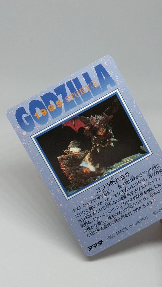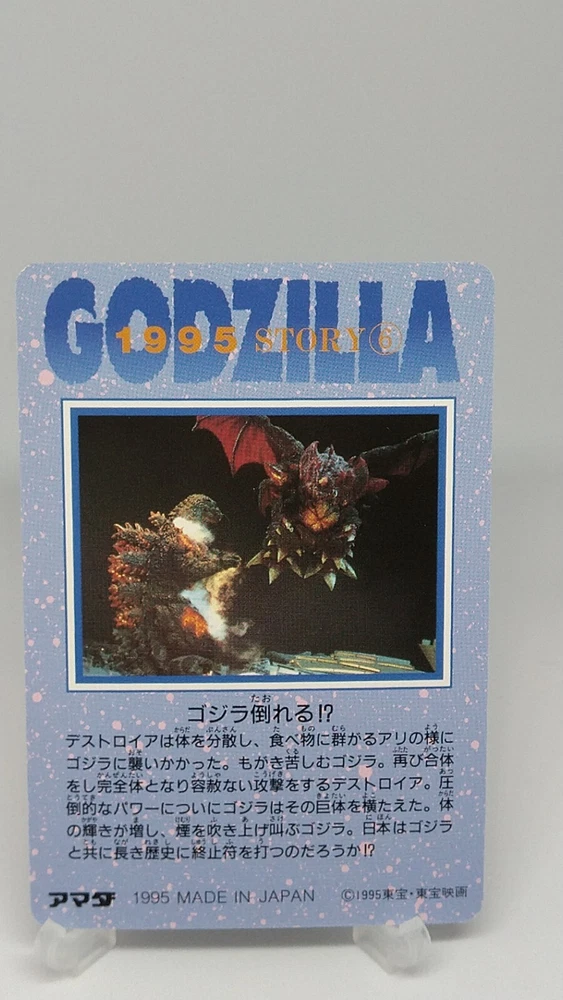 Godzilla Godzilla vs Destoroyah Trading Card No.42 AMADA Japanese 1995 Toho Description Beautiful Please see the picture for the details of damages and dirt or ask us before your purchase. 100% Authentic or Money Back Guaranteed. (Do not worry you are protected by eBay and eBay Managed Payments) See the pictures for more details. If you have any question about the condition, accessories, or anything about the product, please feel free to message us. We are glad to answer all your concerns. Payment Same as ebay payment method. Shipping Economy shipping: Delivery time will be about 11 - 23 days with tracking number. Standard shipping: Delivery time will be about 5 - 10 days with tracking number. Expedited shipping: Delivery time will be about 1 - 4 days with tracking number. Terms of Sale Money back guarantee within 30 days if returned by customer. We would not be able to accept your bid if you; 1) Don't have a PayPal account. 2) Have unpaid items reported. 3) Have a primary shipping address in countries you don't ship to. 4) Have reportedly violated eBay policies. 5) Have a Feedback score lower than the number you specify. International Buyers - Please Note: Import duties, taxes and charges are not included in the item price or shipping charges. These charges are the buyer's responsibility. Please check with your country's customs office to determine what these additional costs will be prior to bidding/buying. These charges are normally collected by the delivering freight (shipping) company or when you pick the item up - do not confuse them for additional shipping charges.