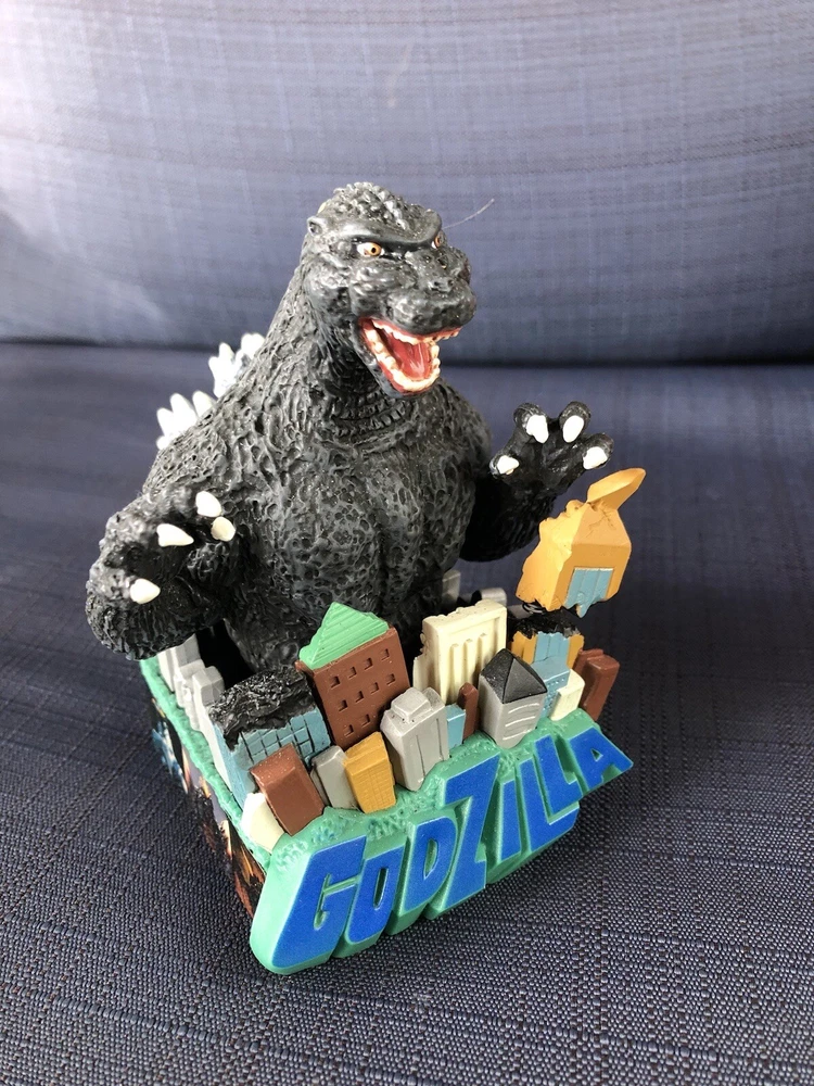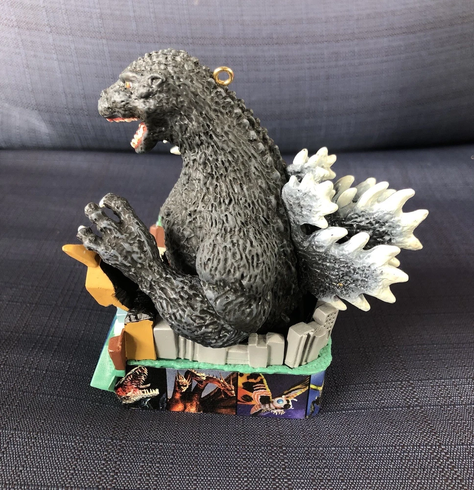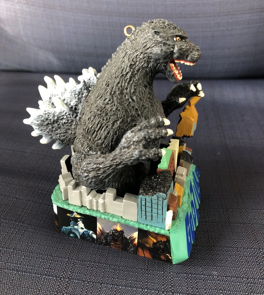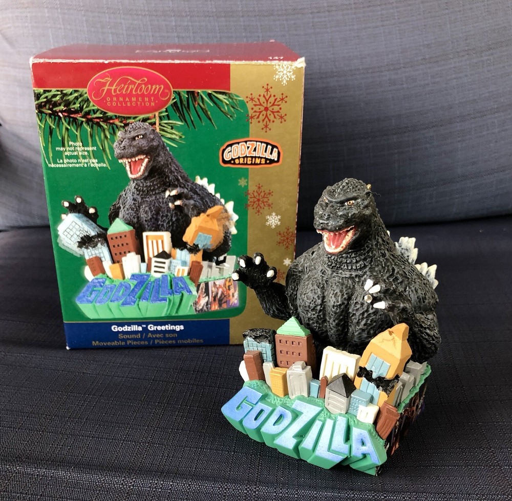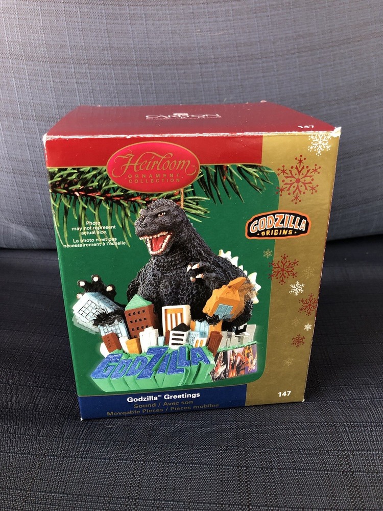 Godzilla Greetings Carlton Heirloom Christmas Ornament Sound 2006 #147 *VIDEO*. Preowned Godzilla Greetings ornament. Box shows some wear, see photos. See video in photos to see and hear ornament! Plays the Godzilla then when you touch button in back corner. Godzilla and the building are both in springs do they “shake”. Very cute! Smoke free home.