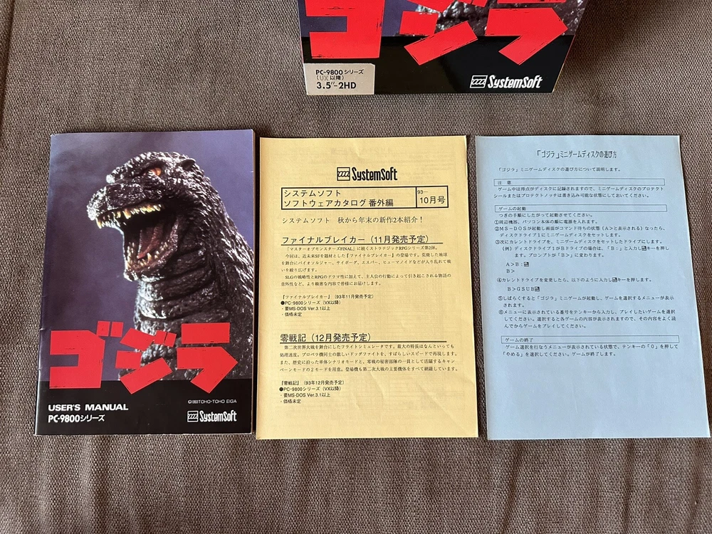 UK & GERMAN BUYERS PM ME IF YOU WANT TO BUY ANYTHING Up for sale is japanese big boxed edition of Godzilla game for PC-9800 systems. Set includes envelopes with 11 x 3,5” game disks, manual and reference cards. Shipping from Poland. Standard option is Global Express and fully tracked, from mine to buyers end. It should take 2 weeks for Europe, 3 for worldwide. Check out my other auctions, where you can find more rare games