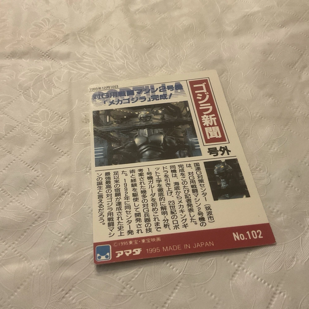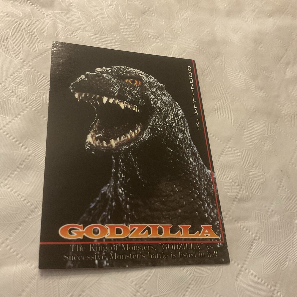 This Godzilla Jr. trading card, numbered 102, was produced in Japan by JPP/Amada in 1995. The card features the popular character Godzilla in the set of Godzilla Story Cards, and is written in Japanese. It would be a great addition to any collector's non-sport trading card collection, especially for fans of the Godzilla franchise. The card is in excellent condition and ready for display or storage.
