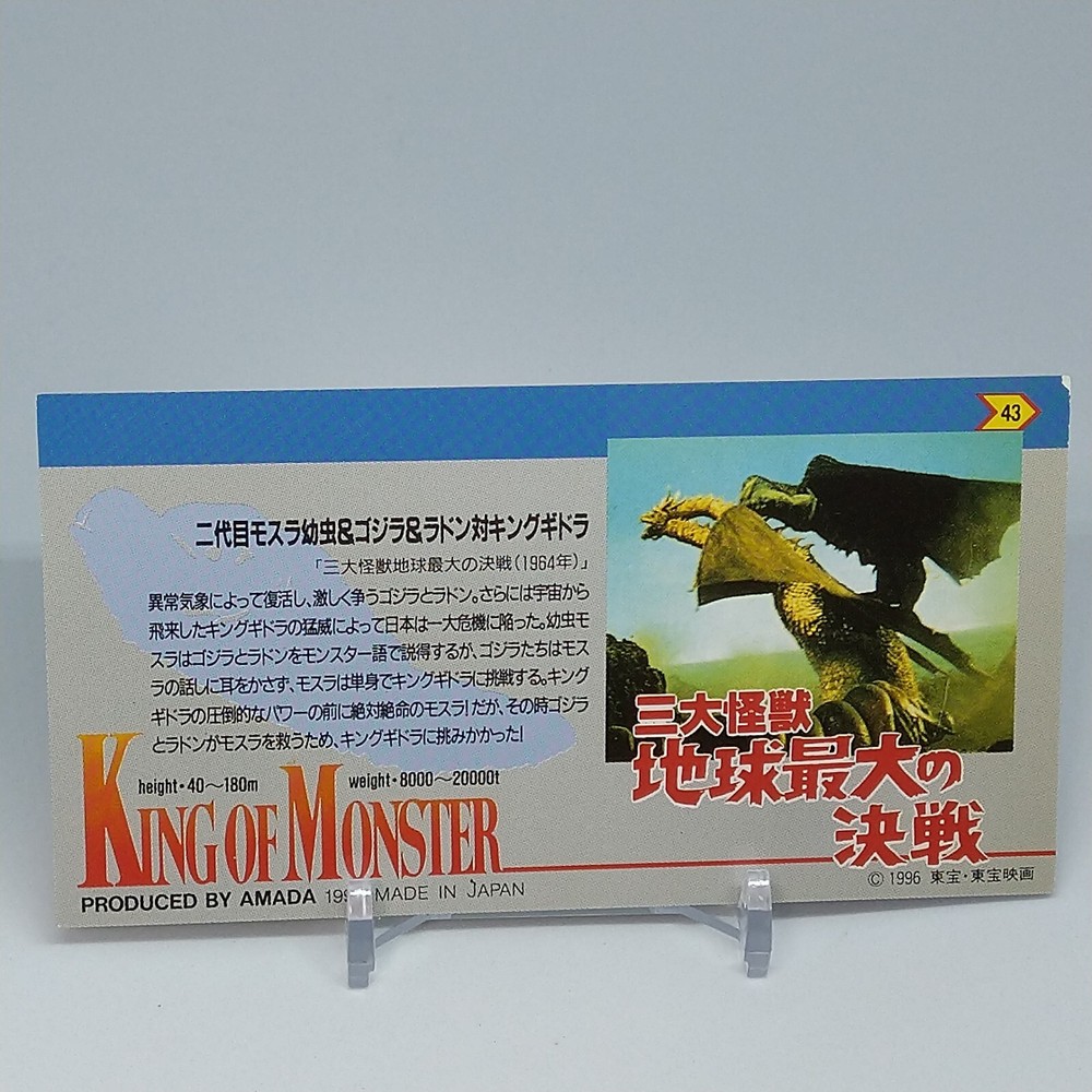 Godzilla King Ghidorah King of Monster Amada Wide Collection Card No.43 1996 Description Please see the picture for the details of damages and dirt or ask us before your purchase. 100% Authentic or Money Back Guaranteed. (Do not worry you are protected by eBay and eBay Managed Payments) See the pictures for more details. If you have any question about the condition, accessories, or anything about the product, please feel free to message us. We are glad to answer all your concerns. Payment Same as ebay payment method. Shipping Economy shipping: Delivery time will be about 11 - 23 days. Standard shipping: Delivery time will be about 5 - 10 days. Expedited shipping: Delivery time will be about 1 - 4 days. Terms of Sale Money back guarantee within 30 days if returned by customer. We would not be able to accept your bid if you; 1) Don't have a PayPal account. 2) Have unpaid items reported. 3) Have a primary shipping address in countries you don't ship to. 4) Have reportedly violated eBay policies. 5) Have a Feedback score lower than the number you specify. International Buyers - Please Note: Import duties, taxes and charges are not included in the item price or shipping charges. These charges are the buyer's responsibility. Please check with your country's customs office to determine what these additional costs will be prior to bidding/buying. These charges are normally collected by the delivering freight (shipping) company or when you pick the item up - do not confuse them for additional shipping charges.